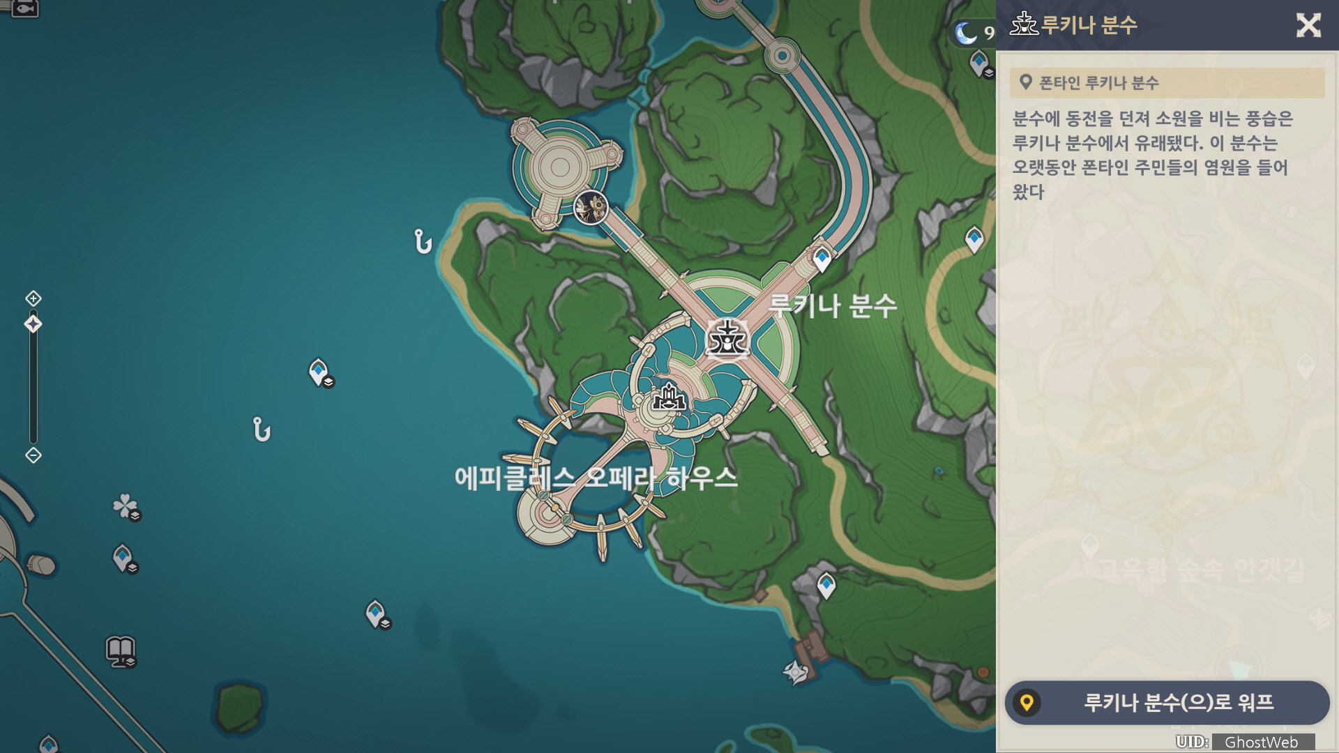 물의 인장은 폰타인 지역에 있는 보물 상자를 열어 획득할 수 있으며 루키나 분수는 에피클레스 오페라 하우스 앞에 위치하고 있으며 분수대와 상호 작용하면 물의 인장 공양을 할 수 있어요.