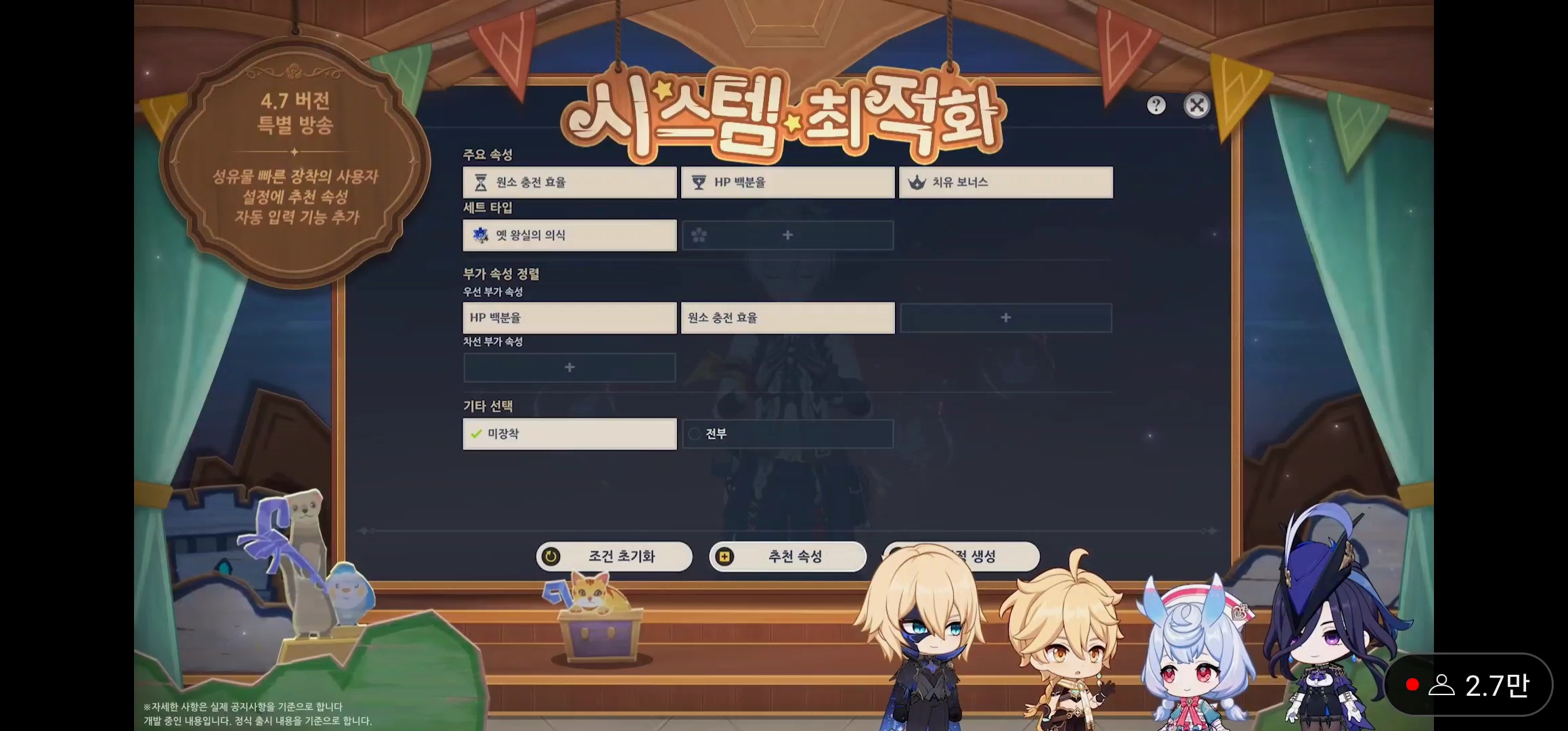 - 성유물 빠른 장착의 사용자 설정에 추천 속성 자동 입력 기능 추가