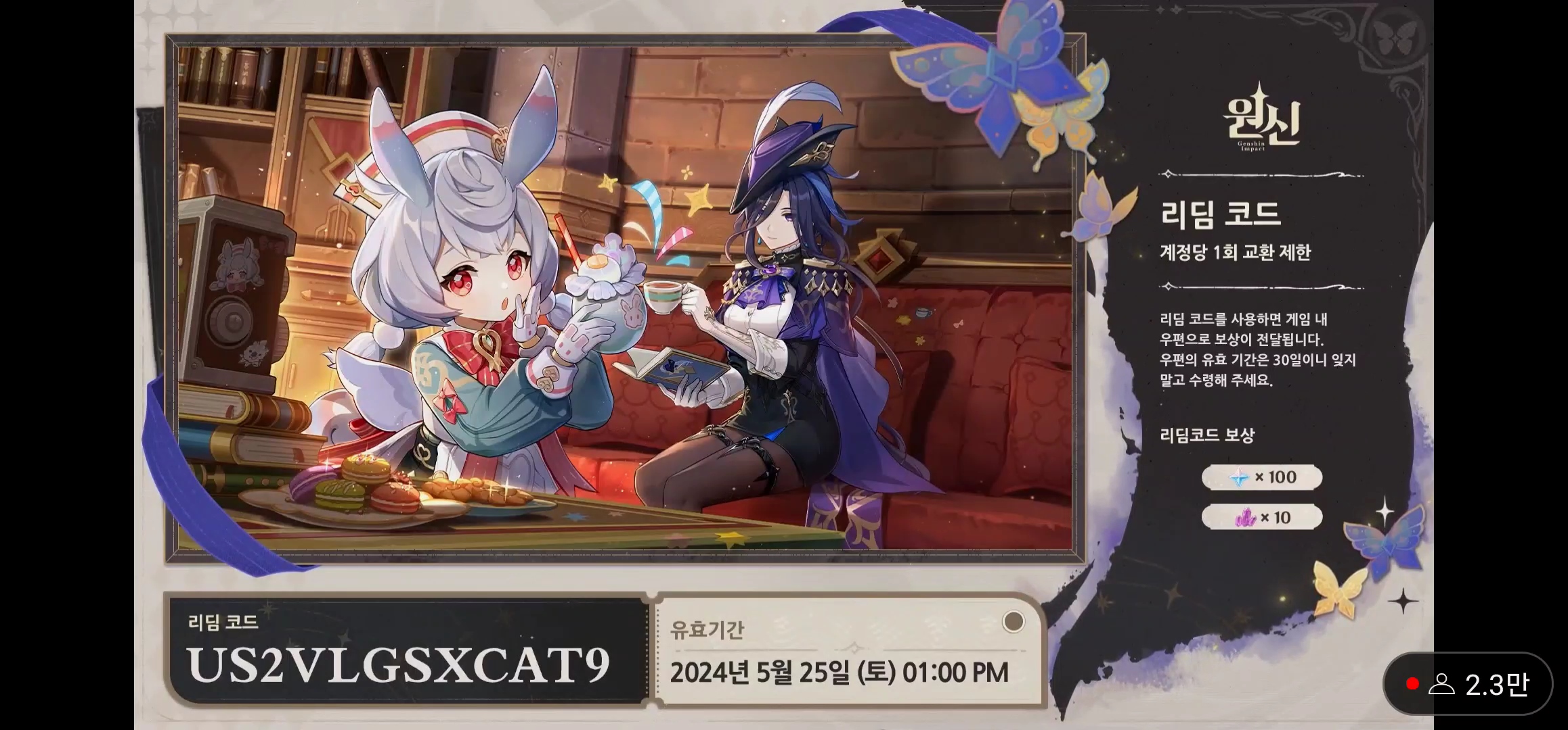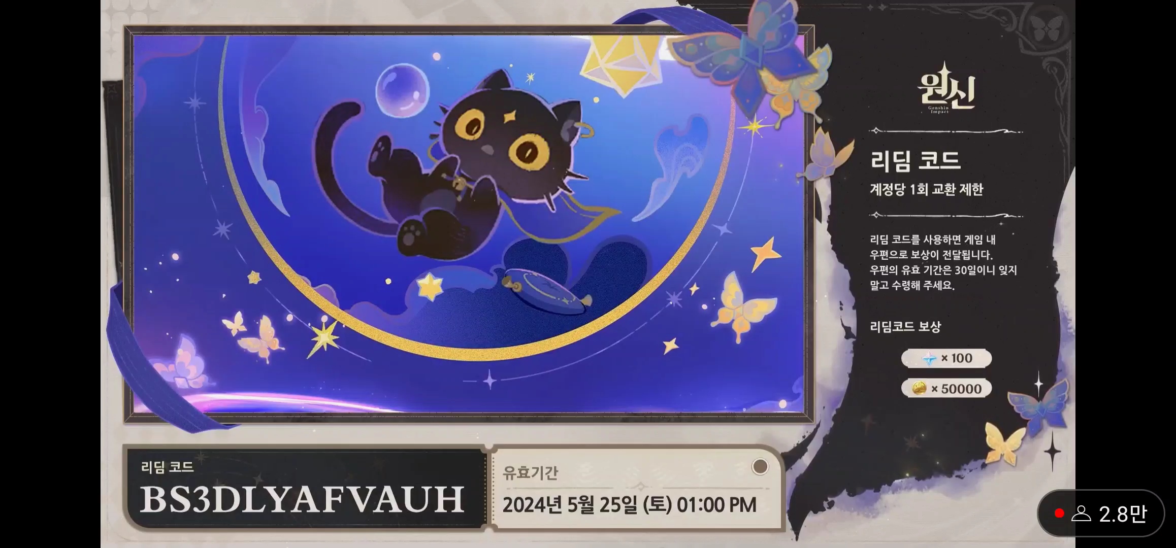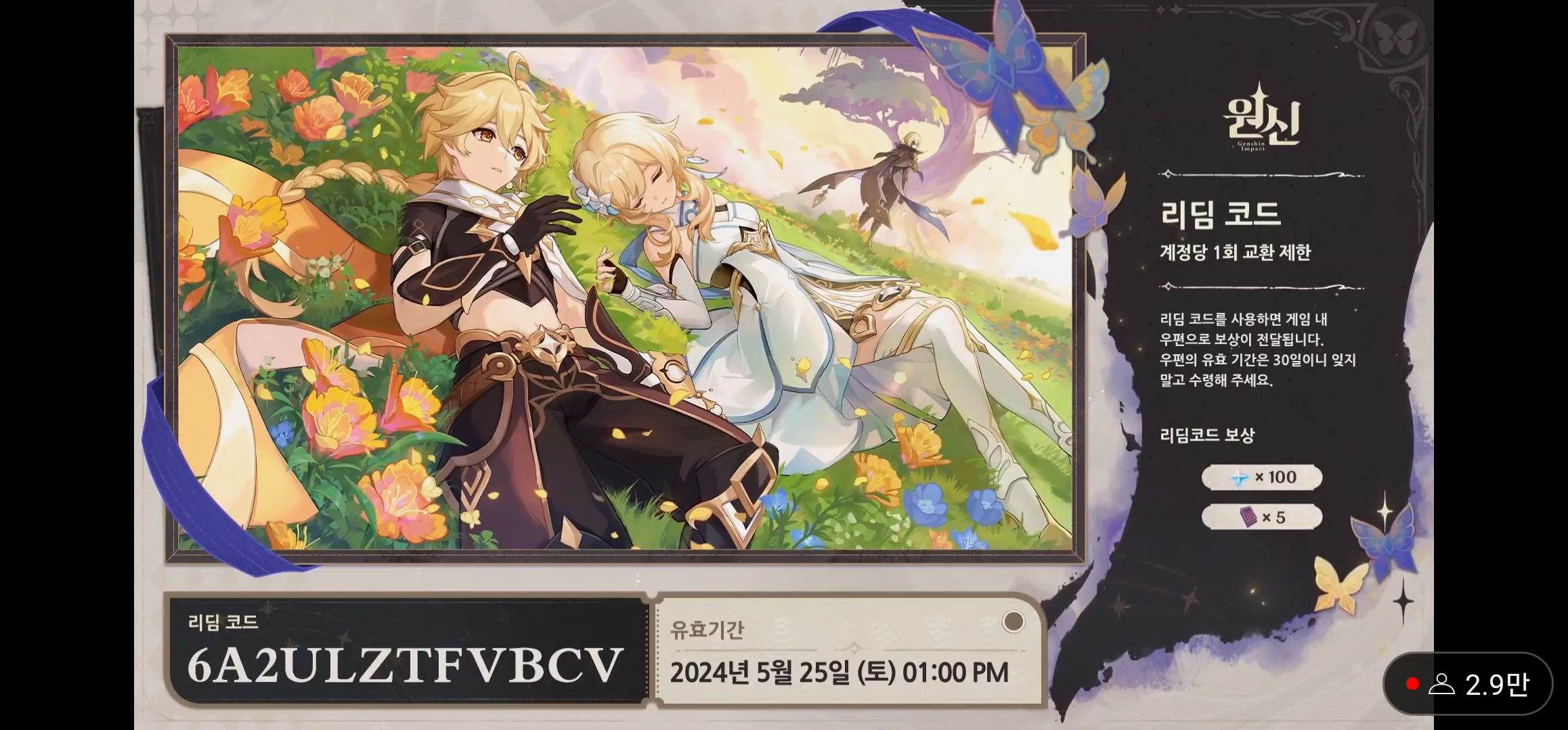 원신 업데이트 특별 방송 등을 보면 중간 마다 리딤코드라는 것을 보여주는데 이를 원신 홈페이지에서 입력하면 원석과 각 코드별로 아이템을 얻을 수 있어요. ※ 유효기간은 대부분 특별 방송