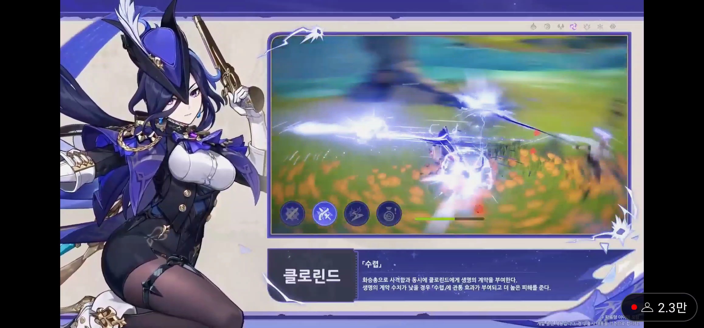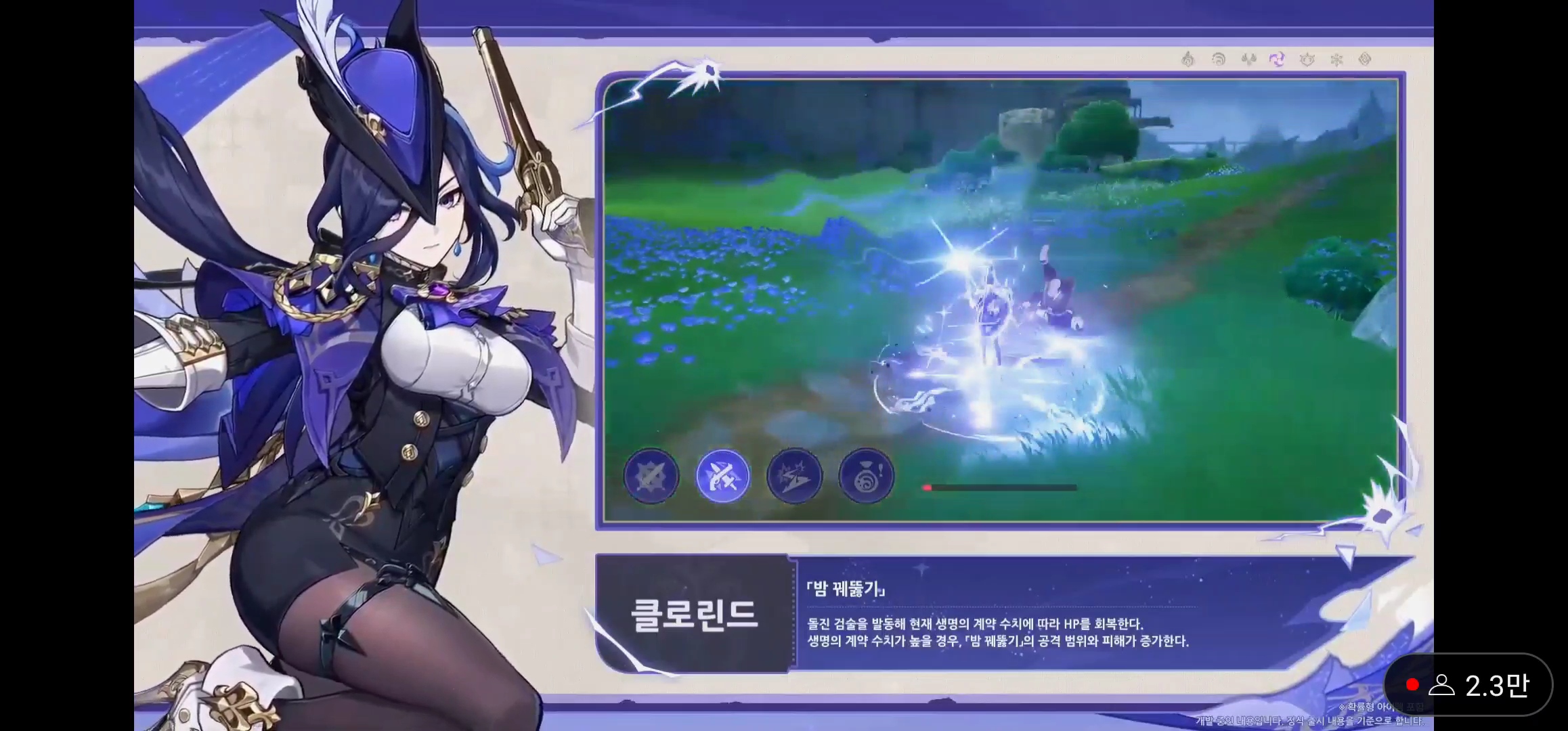 - 파티내의 캐릭터가 적에게 번개 원소 관련 반응을 발동하면 클로린드가 일반 공격으로 가하는 번개원소 피해와 원소 폭발 피해가 자신의 공격력에 따라 증가