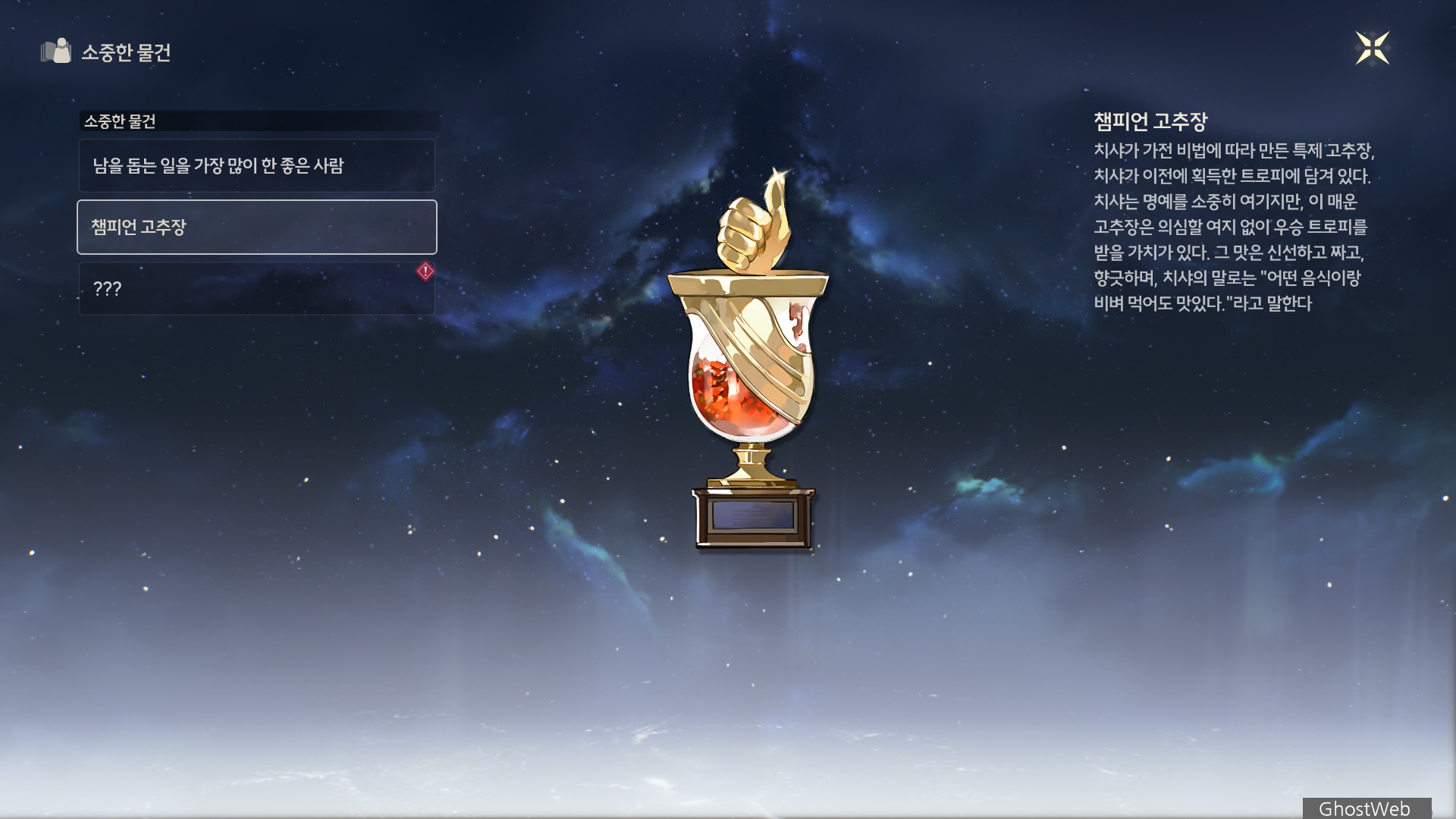 | 치샤의 취미 | 극장에서 하는 영웅극은 정말 최고야! 특히 황룔 명절에 다들 모여 떠들썩한 분위기에서 연극을 보고 있으며 모두의 얼굴에 행복한 웃음꽃이 핀다고! 상상만 해도 너무 좋아 |