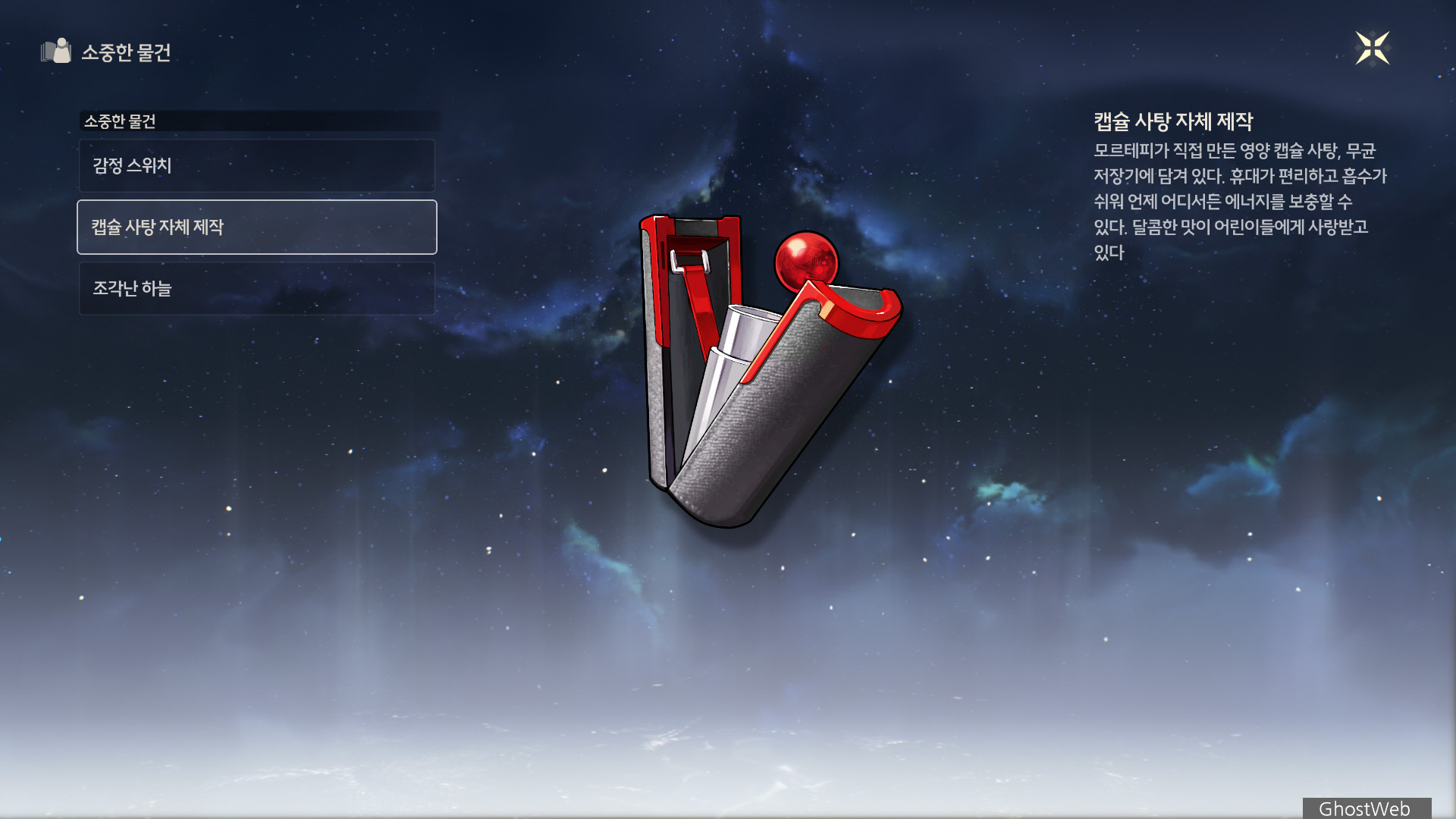 | 생일 축하 | 생일 축하해! 평소에 줄곧 실험실에 틀어박혀 실험하느라 바밨지만 오늘 같은 중요한 날은 당연히 기억하고 있지! 이건 50가지 이상의 버전을 반복하여 만든 다기능 전술 벨트로 조명, 부스트, 공기 주입까지... 너가 야외에서 겪는 번거로움을 대처하기에 충분할거야! 또 원하는 기능이 있다면 언제든 나를 찾아오게! |