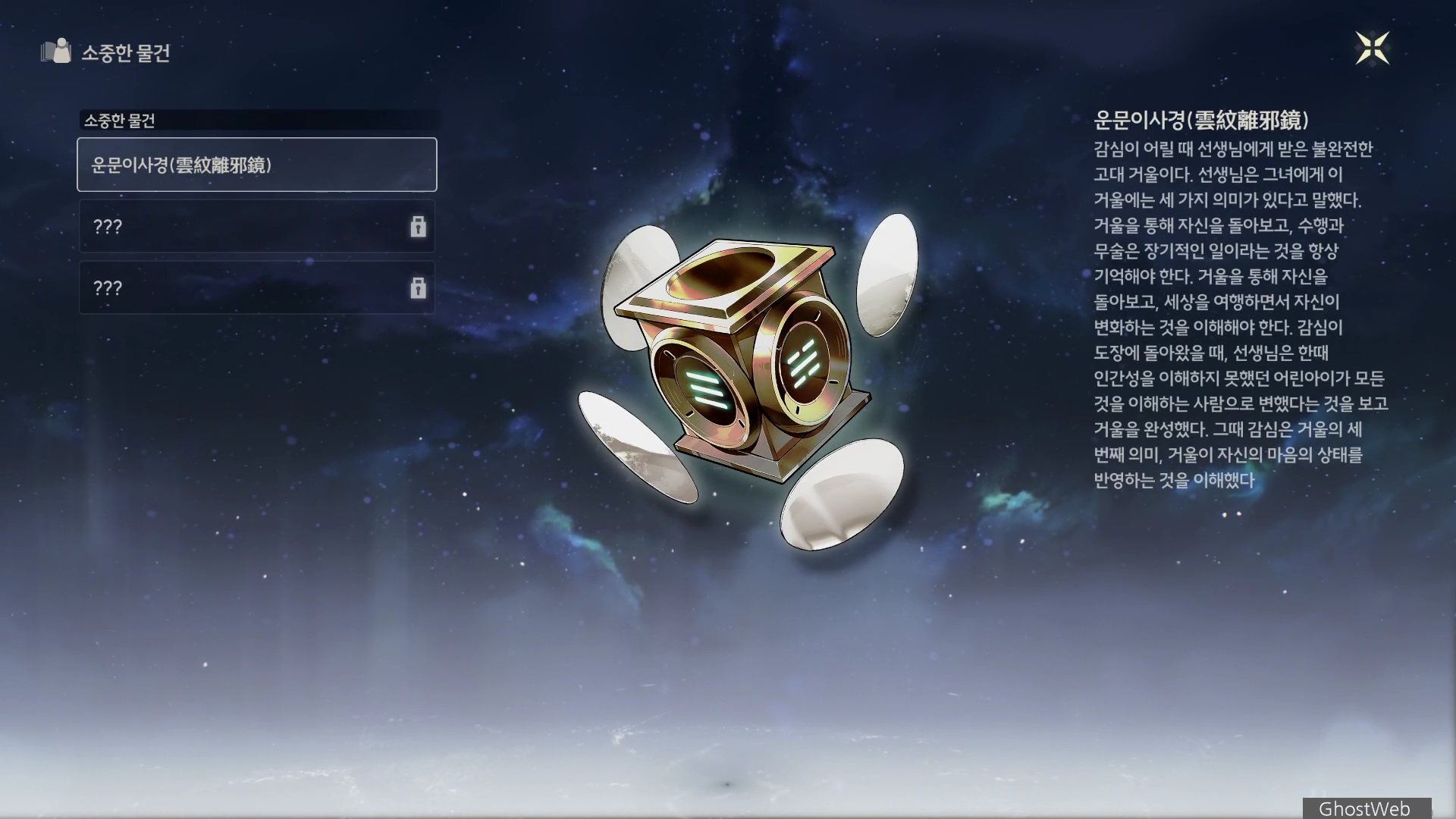 | 나의 이야기 1 | 십릉 사부님이 주신 운문이사경에는 많은 뜻이 담겨 있어요. 사부님들의 당부, 바람, 그리고 관심부터 제 성장에 대한 가르침까지 모든 게 들어가있죠. 그래서 이 겨울은 제 모든 인연의 추억이 있는 거니까 소중히 간직하고 있어요. |