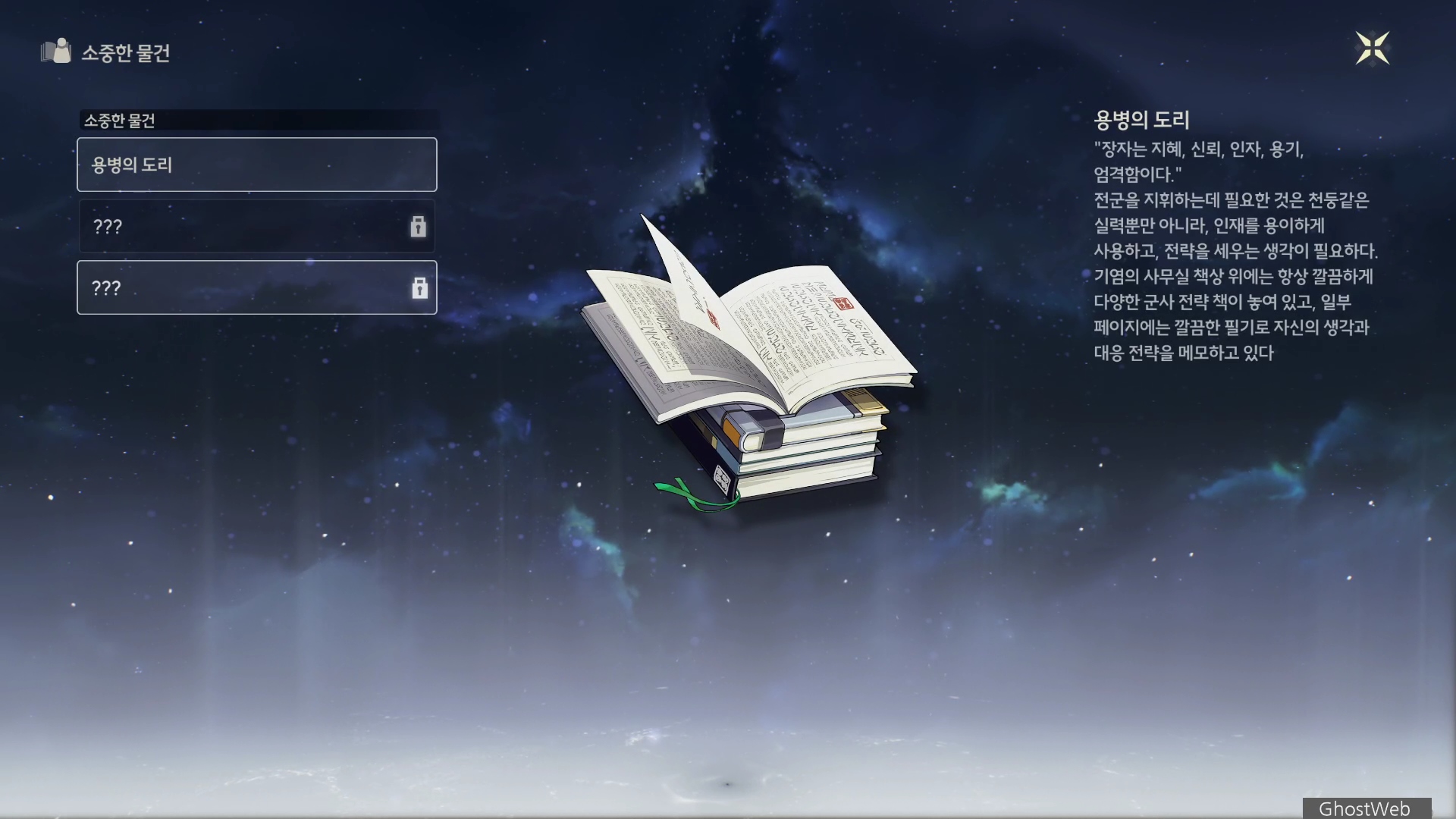 | 나의 이야기 1 | 이 장창은 북망 대장의 무기를 본 떠 만든 것이다. 이 장창에는 혼란을 평정하고 외부의 문제에 저항한다는 뜻 깊은 의미가 담겨있지. |