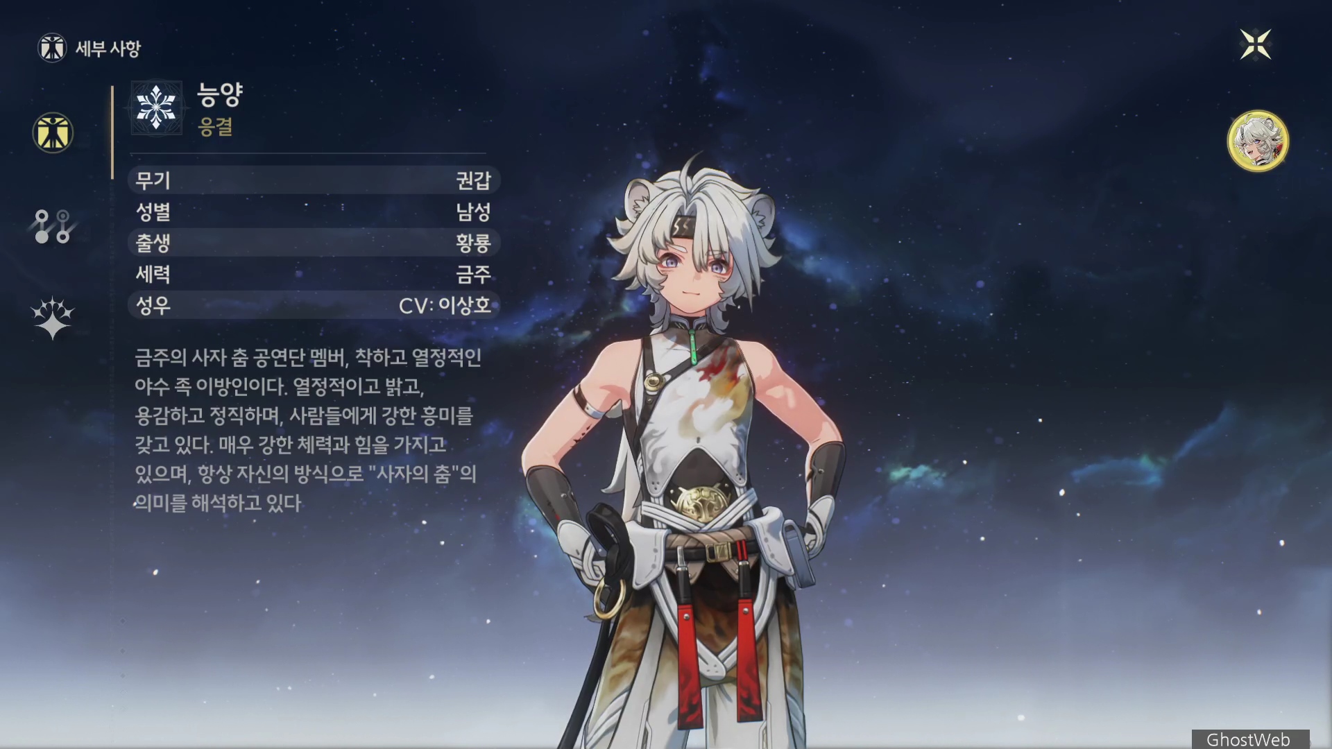 | 2 | 위풍당당한 걸음걸이 | 변주 스킬 출동 · 사자의 기상 발동 시, 능양이 추가로 10pt의 공명 에너지를 회복한다. (20초마다 1회 발동) |