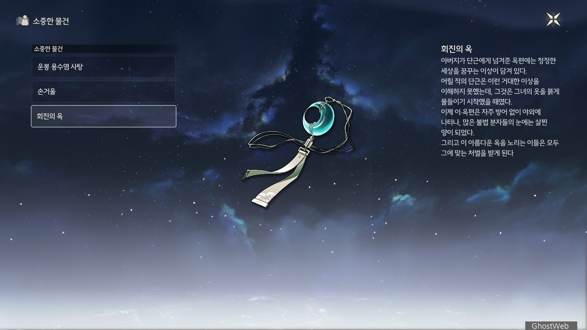 | 나의 이야기 1 | 무슨 일이 있어도, 어떤 일을 당해도 이 옥패는 영원히 맑고 투명할 거예요. |