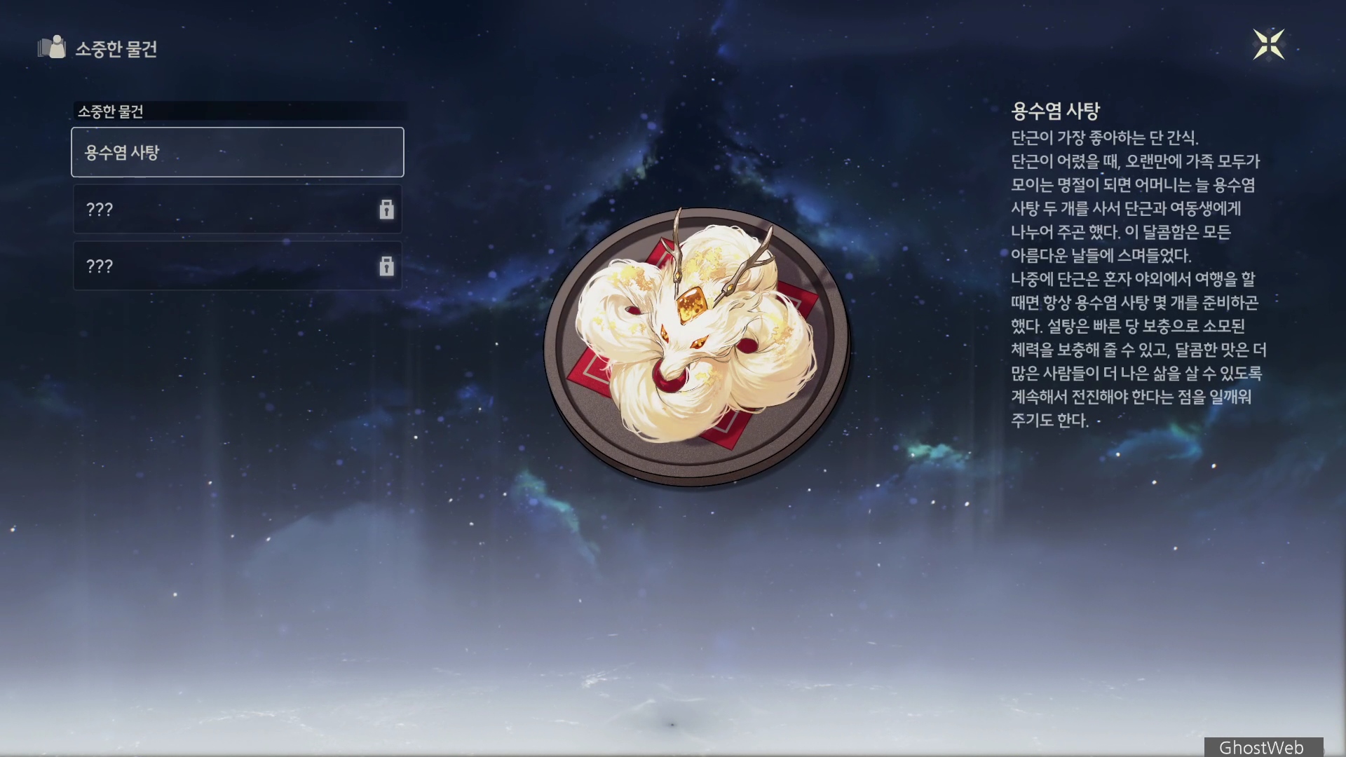 | 생일 축하 | 방랑자! 생일 축하해요! 이 용수염 사탕은 제가 특별히 세광의 수염처럼 길게 만들었어요. 생일날 길쭉한 음식을 먹으면 장수한데요! 어서 먹어봐요! |