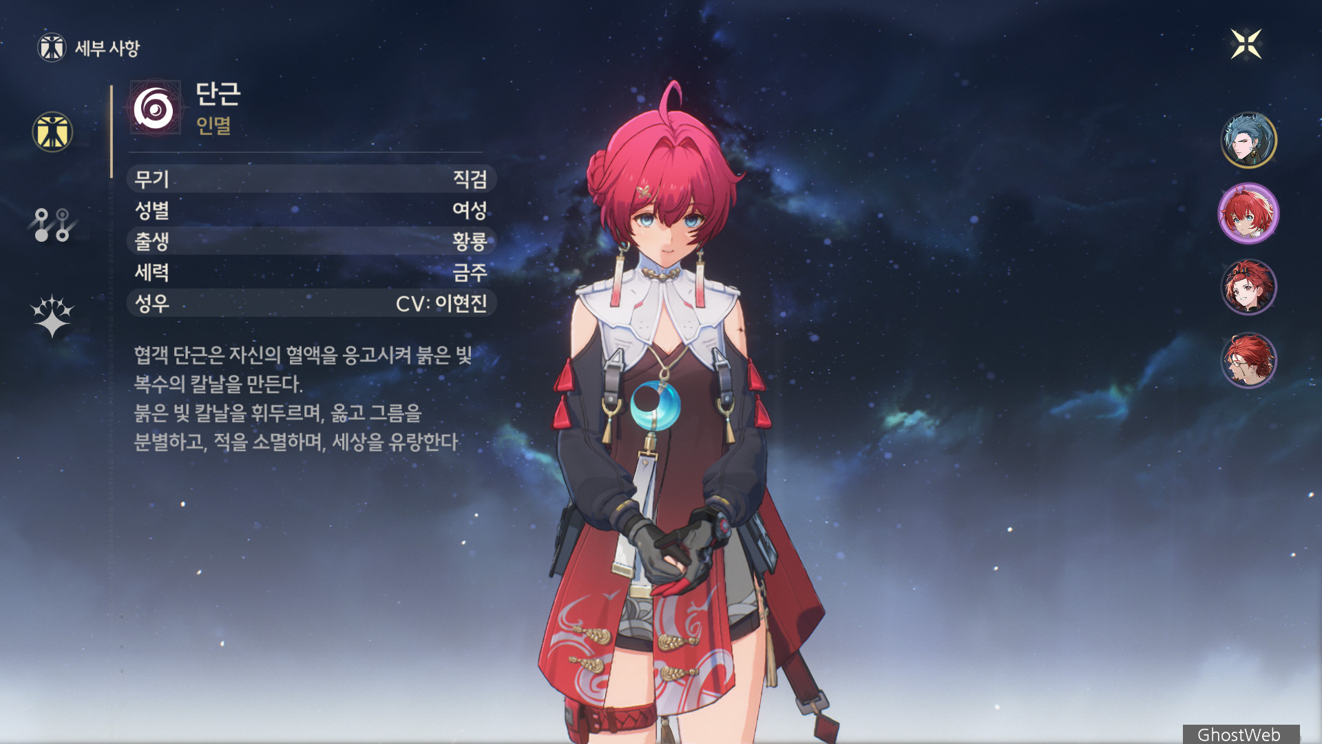 - 붉은 빛 칼날을 휘두르며, 옳고 그름을 분별하고 적을 소멸하며 세상을 유랑한다.