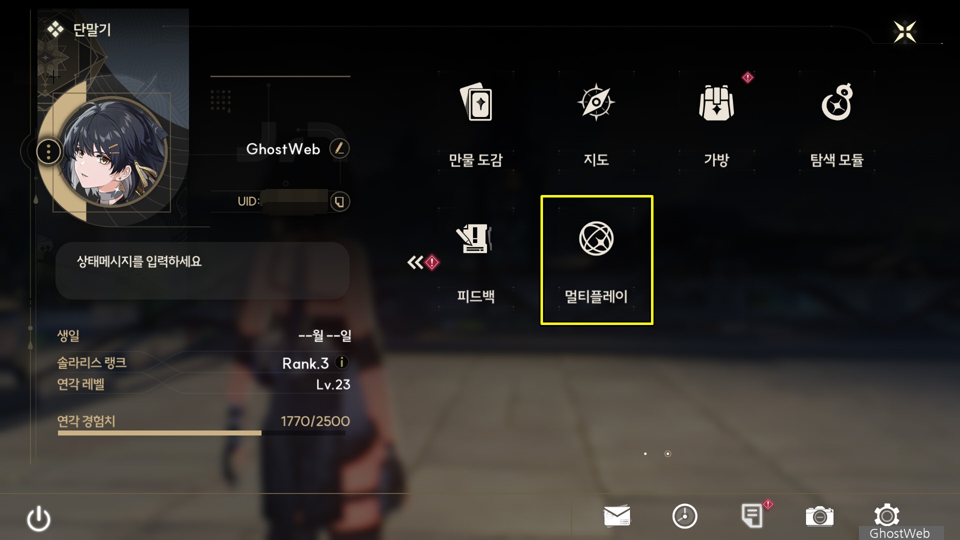 명조를 실행한 후 PC의 경우 ESC키를 눌러 [ 단말기 ]를 열고 페이지를 넘겨 [ 멀티플레이 ] 아이콘을 클릭하세요.