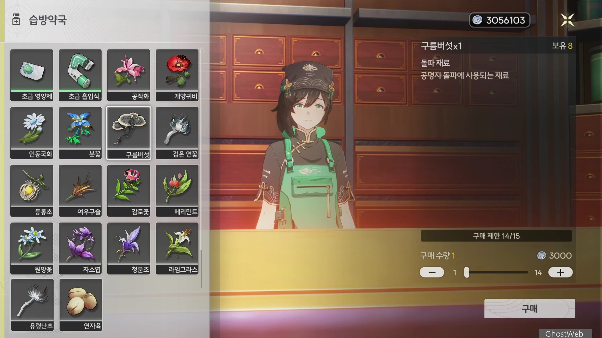 게임 시작 초반에 필드 탐험과 퀘스트 진행 때문에 일부 꽃은 많이 수집하기 어려울 수 있는데 돌파 소재가 부족할 경우 습방약국에서 구매해서 빠르게 캐릭터를 육성할 수 있어요.
