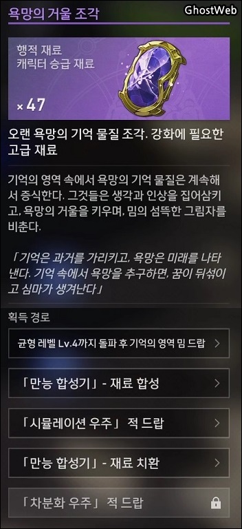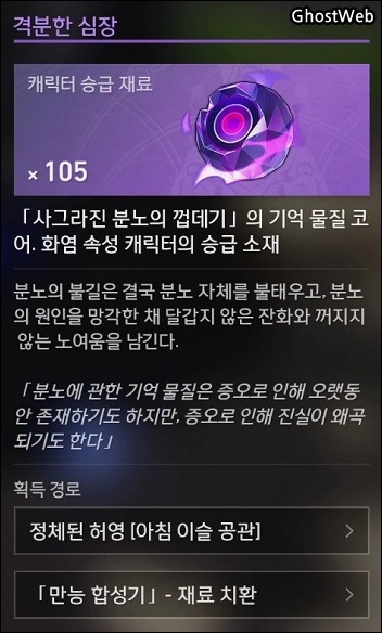 - 승급 재료 : 격분한 심장, 생각의 가루, 인상의 파편, 욕망의 거울 조각