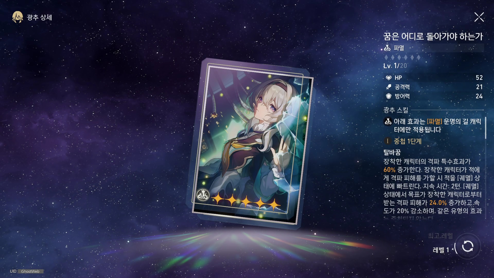 | 5 | 꿈 없는 긴밤에서 비추며 | 필살기 레벨 + 2 (최대 레벨 15) 특성 레벨 + 2 (최대 레벨 15) |