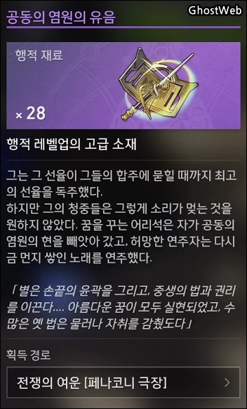 - 행적 재료 : 운명의 발자취, 공동의 염원의 유음, 보리인의 송곳니, 늑대 독 송곳니, 달의 광기 이빨, 생각의 가루, 인상의 파편, 욕망의 거울 조각