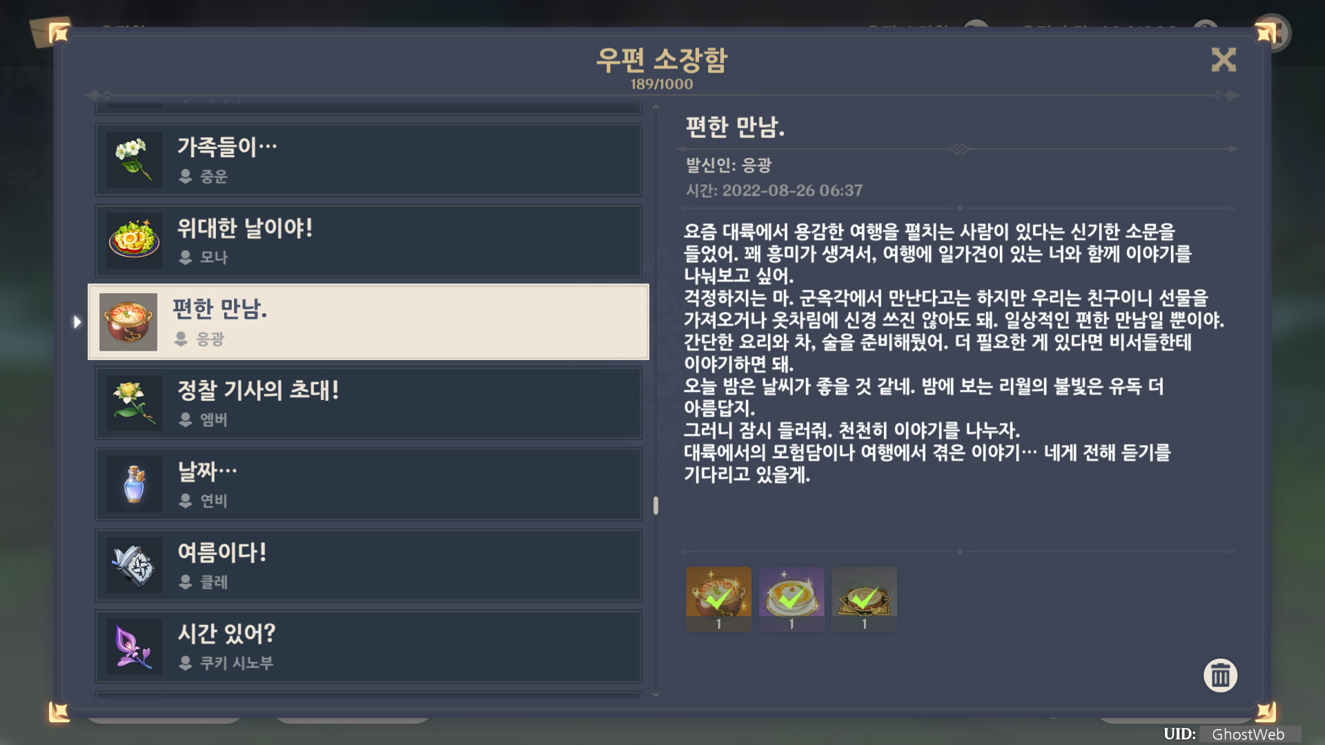 이번에는 원신을 플레이하며 우편함에 보관된 편지들을 포스팅 해보도록 할게요.