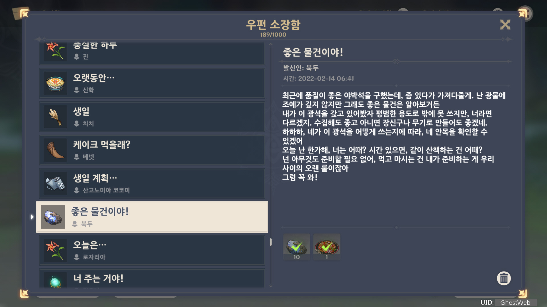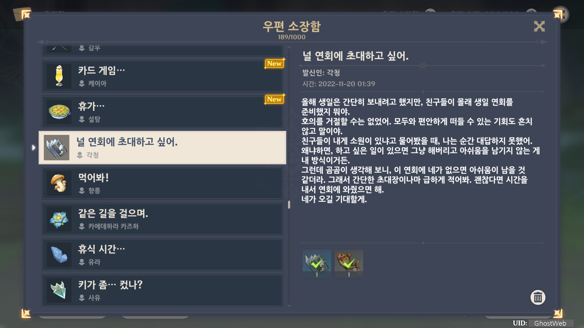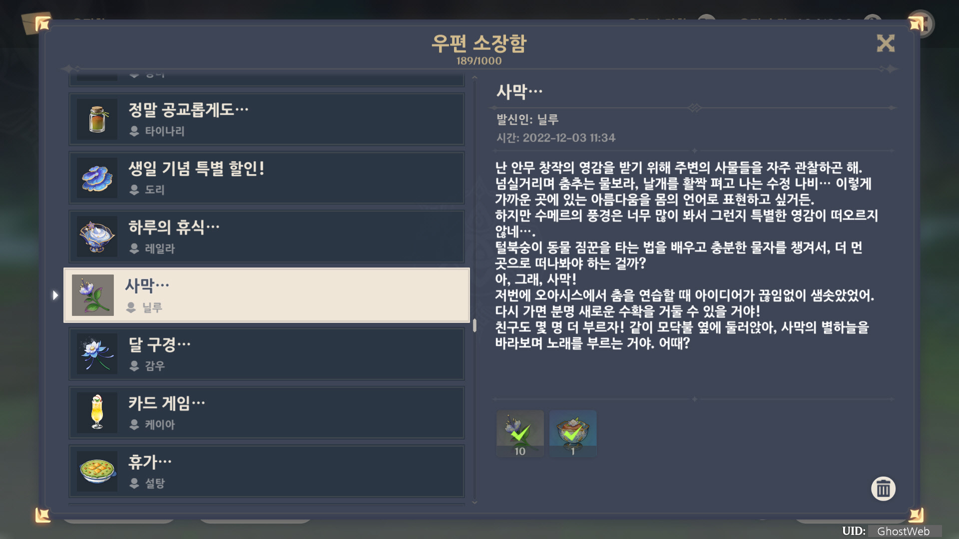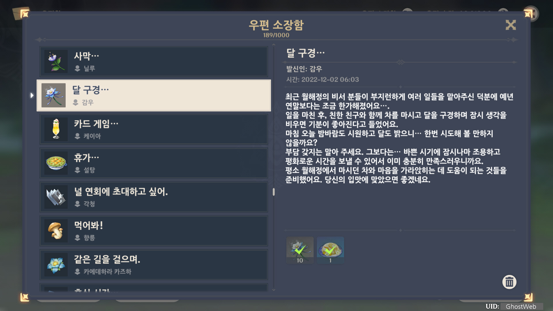 | [원신] 우편 소장함 모음 / 정리 (2023년) (0) | 2024.06.22 |
