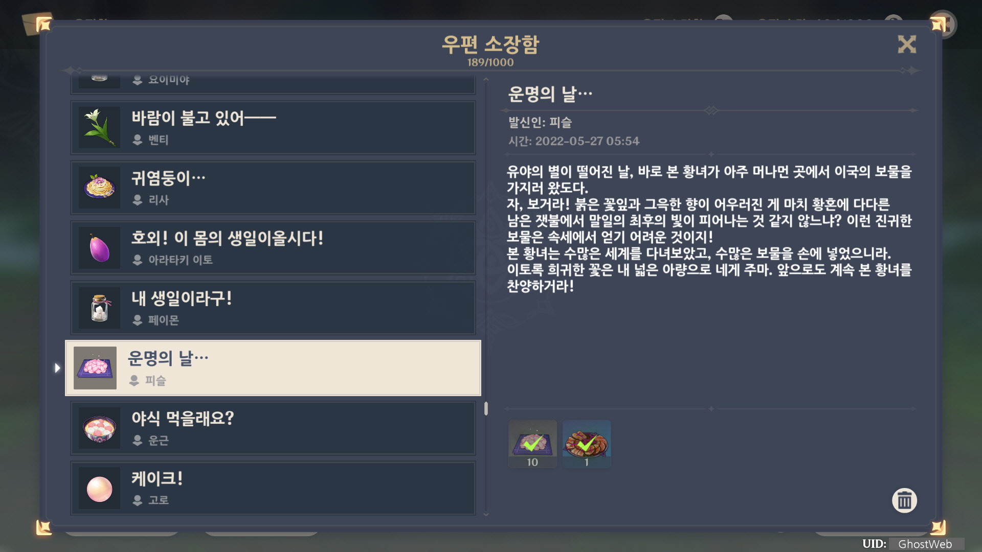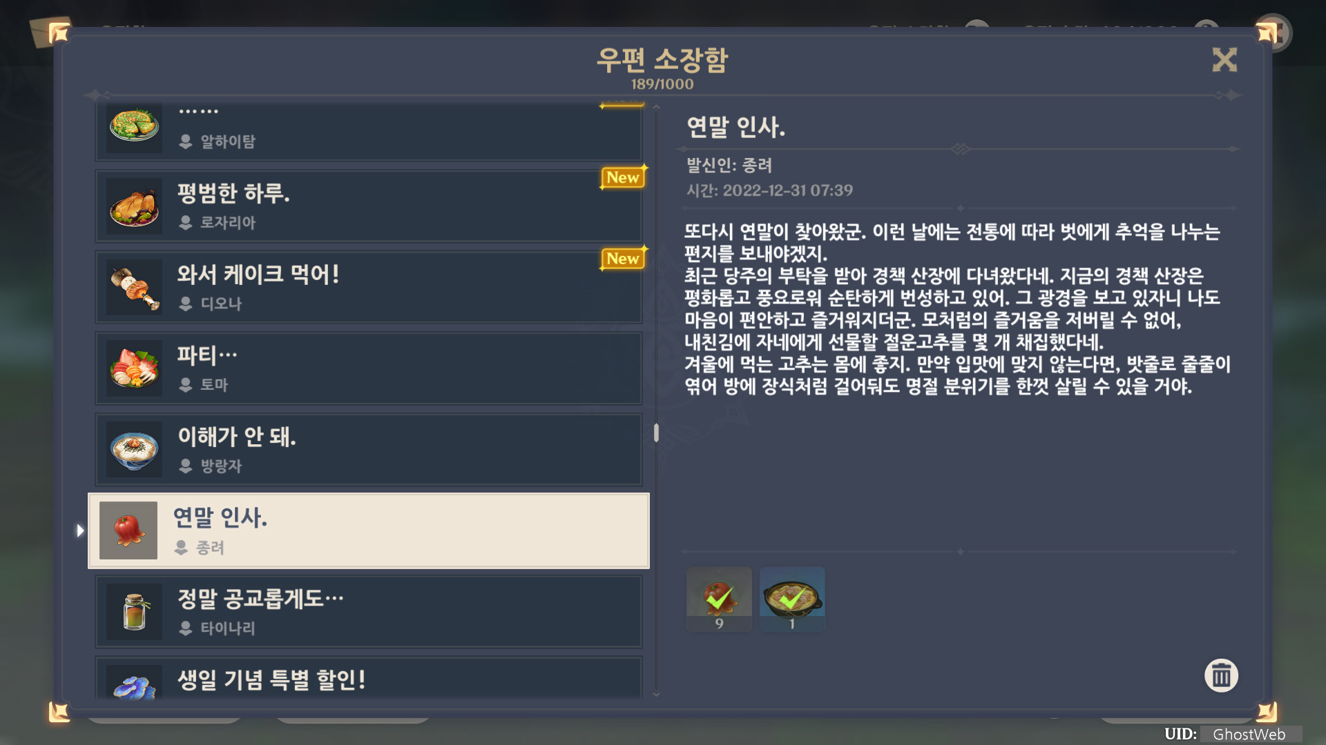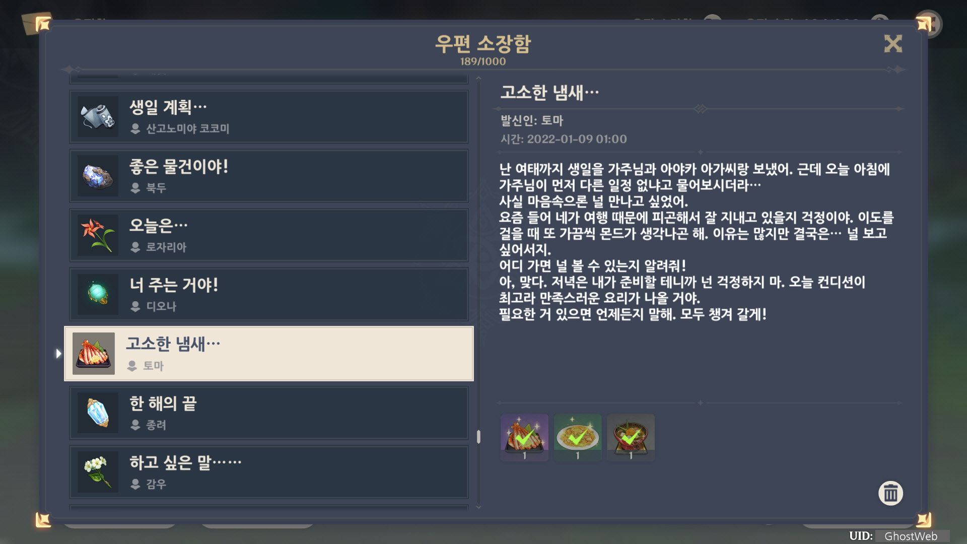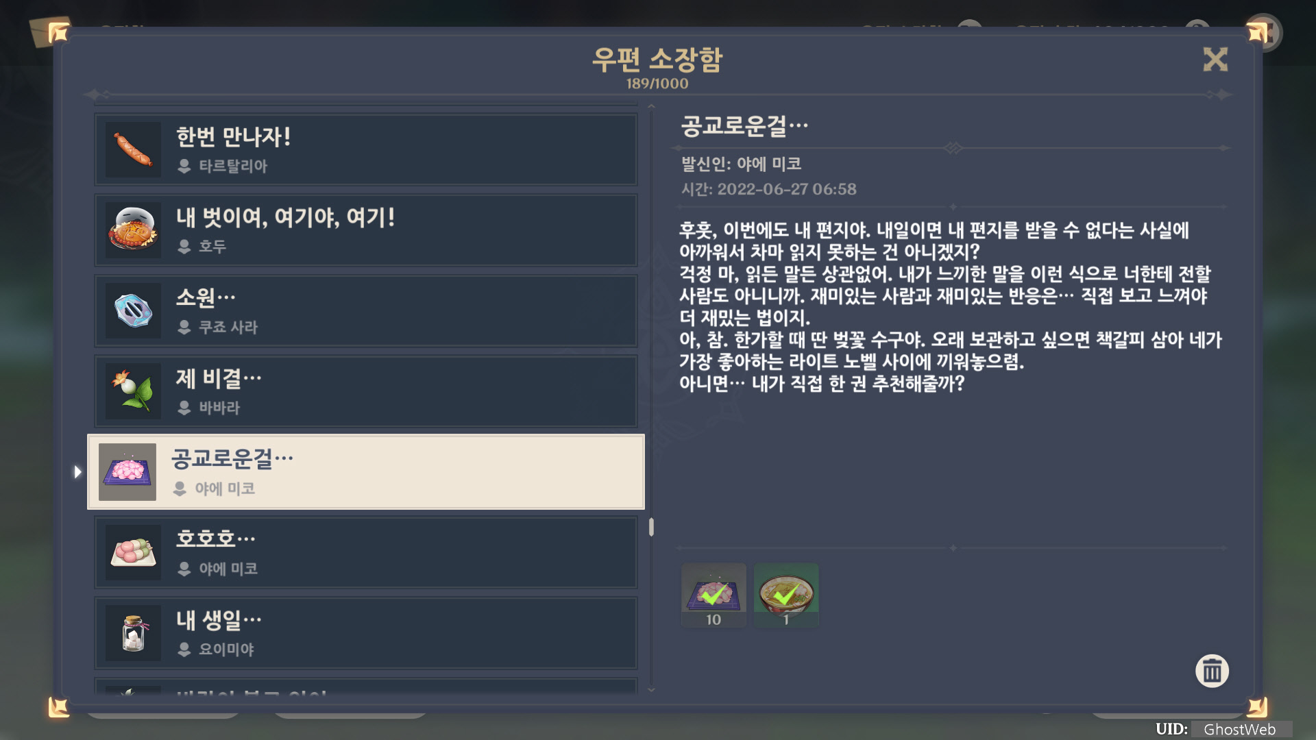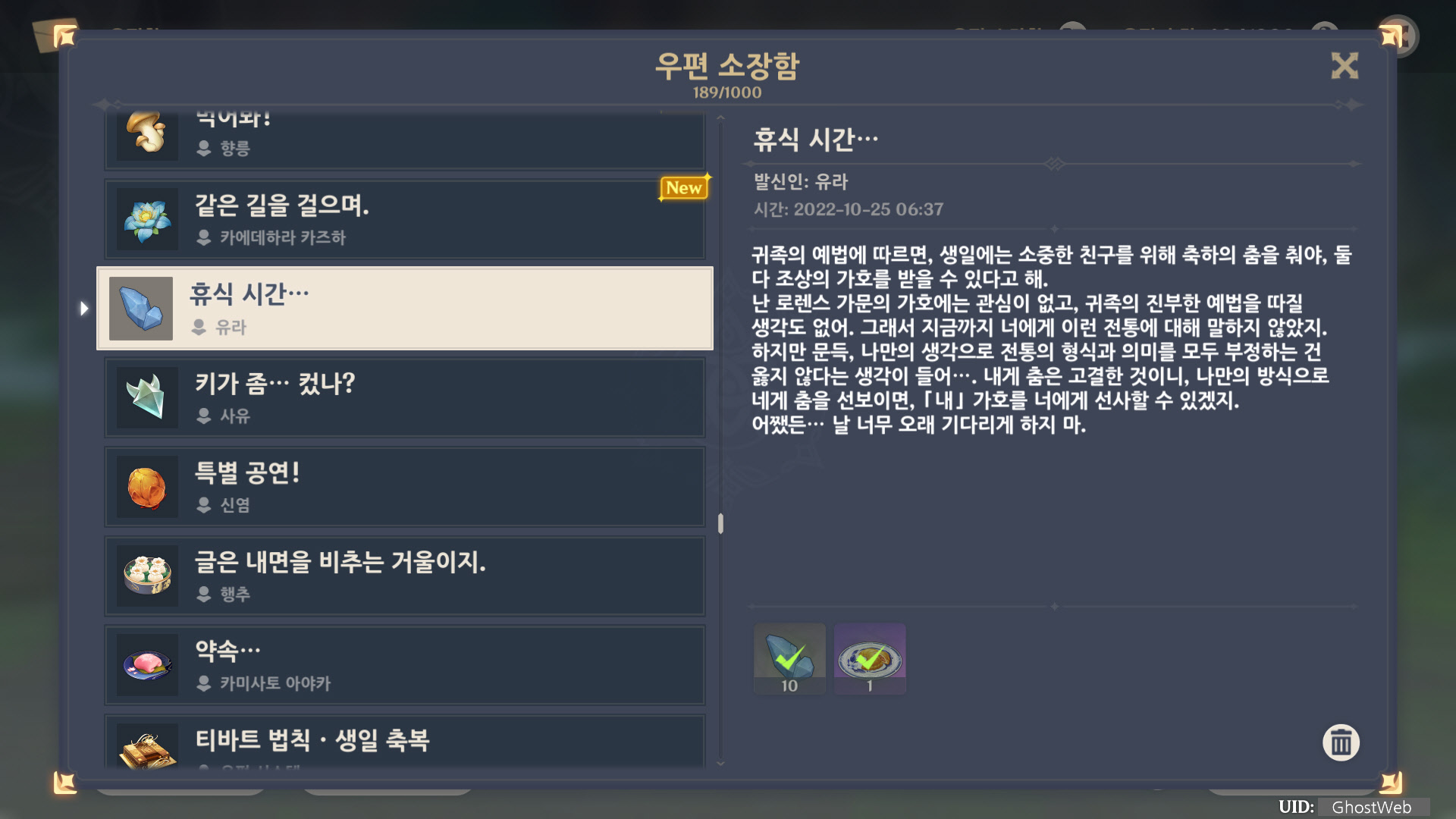 | [원신] 우편 소장함 모음 / 정리 (2023년) (0) | 2024.06.22 |