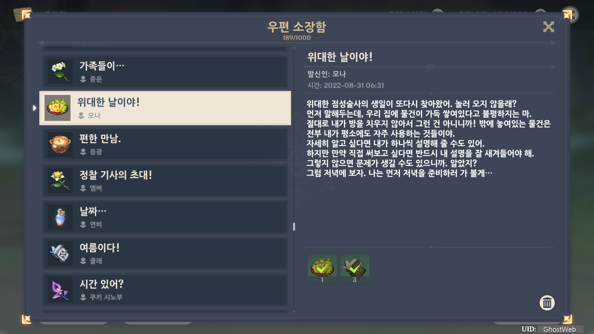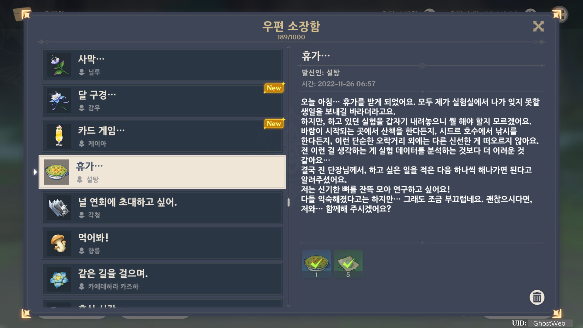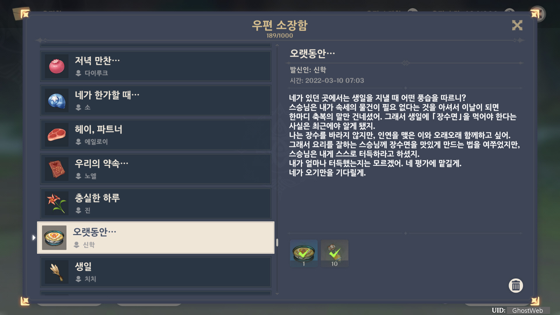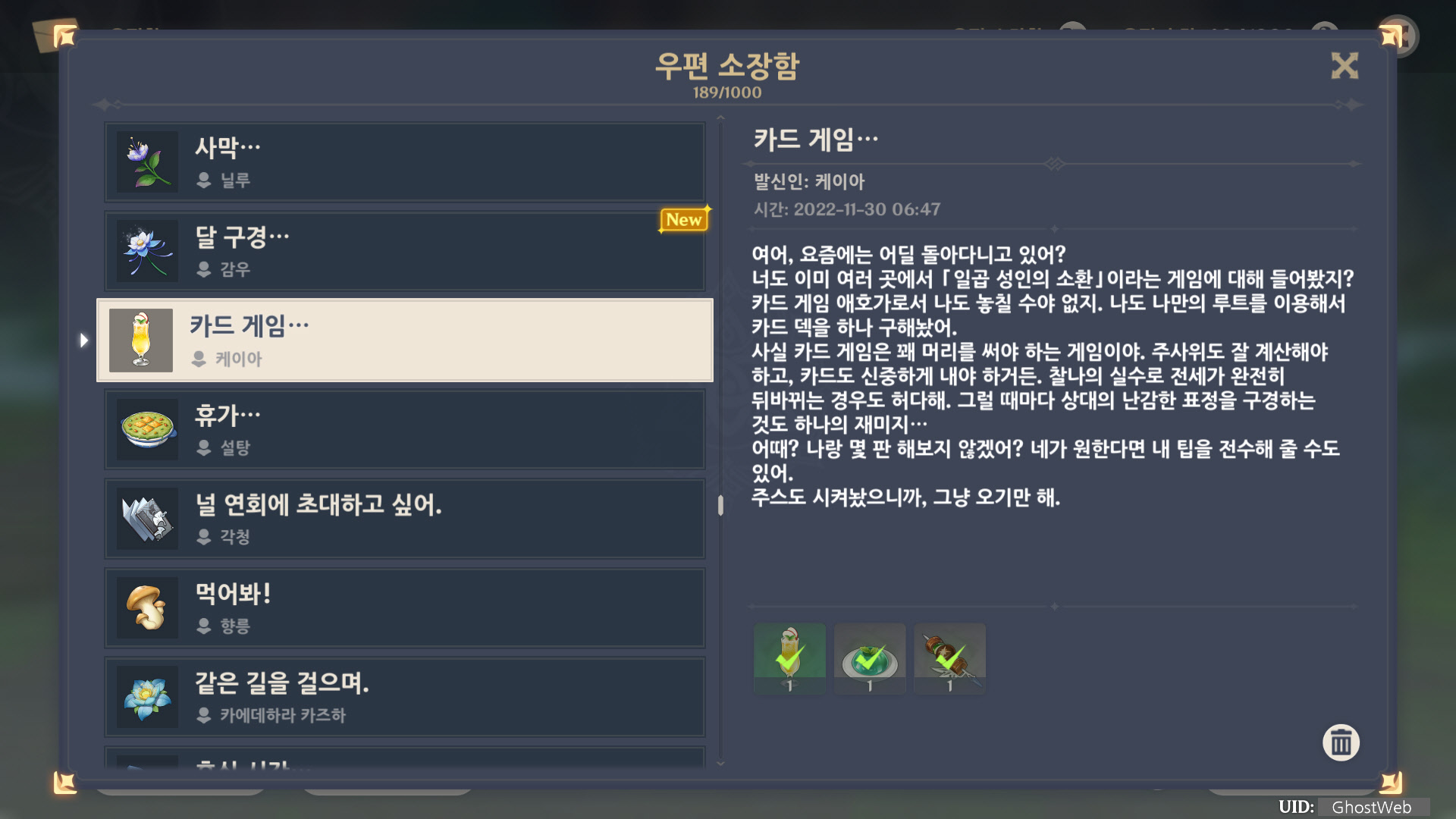 | [원신] 우편 소장함 모음 / 정리 (2023년) (0) | 2024.06.22 |