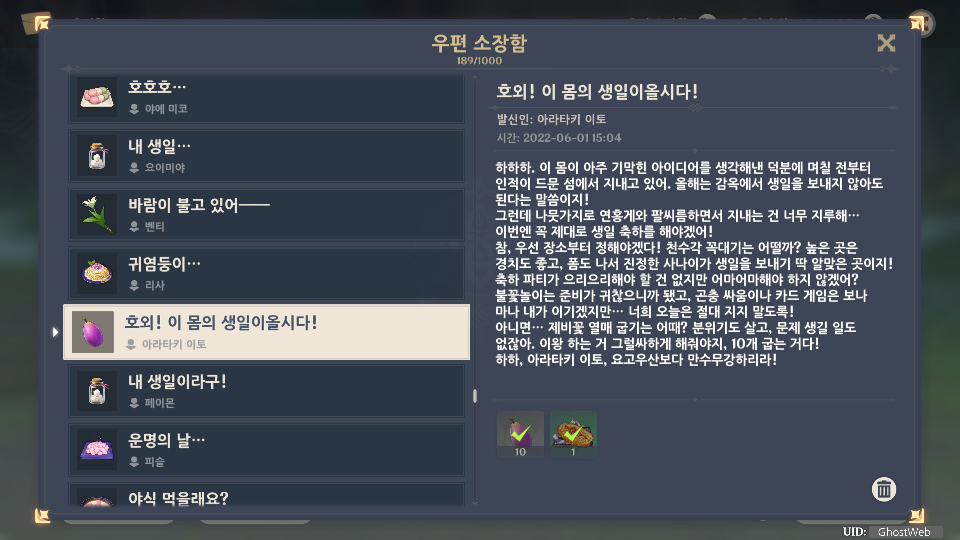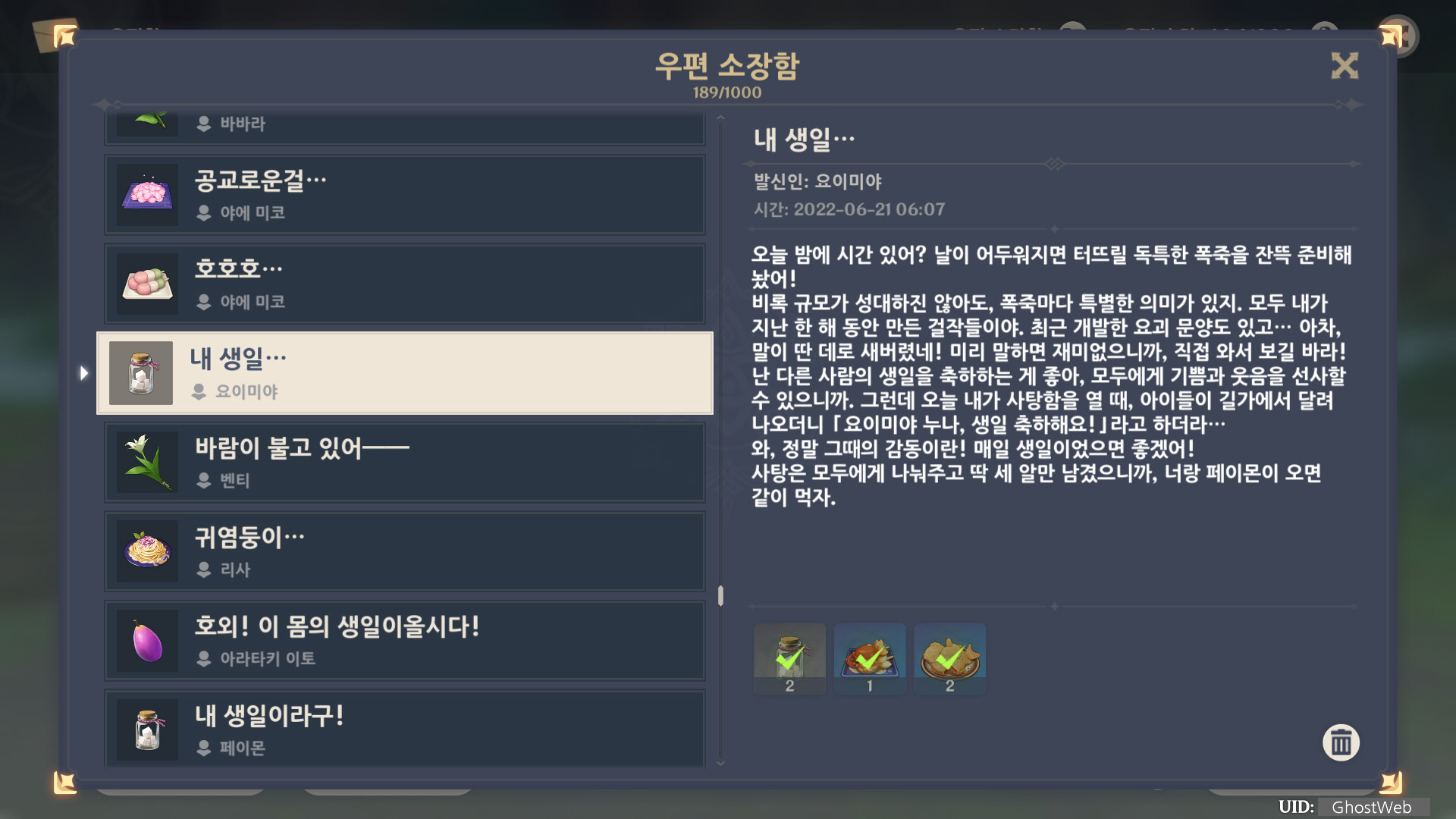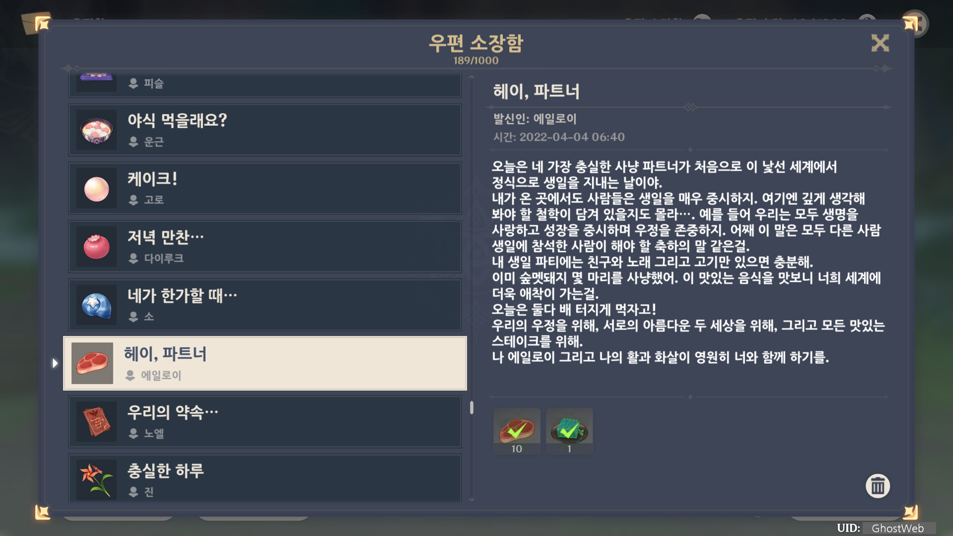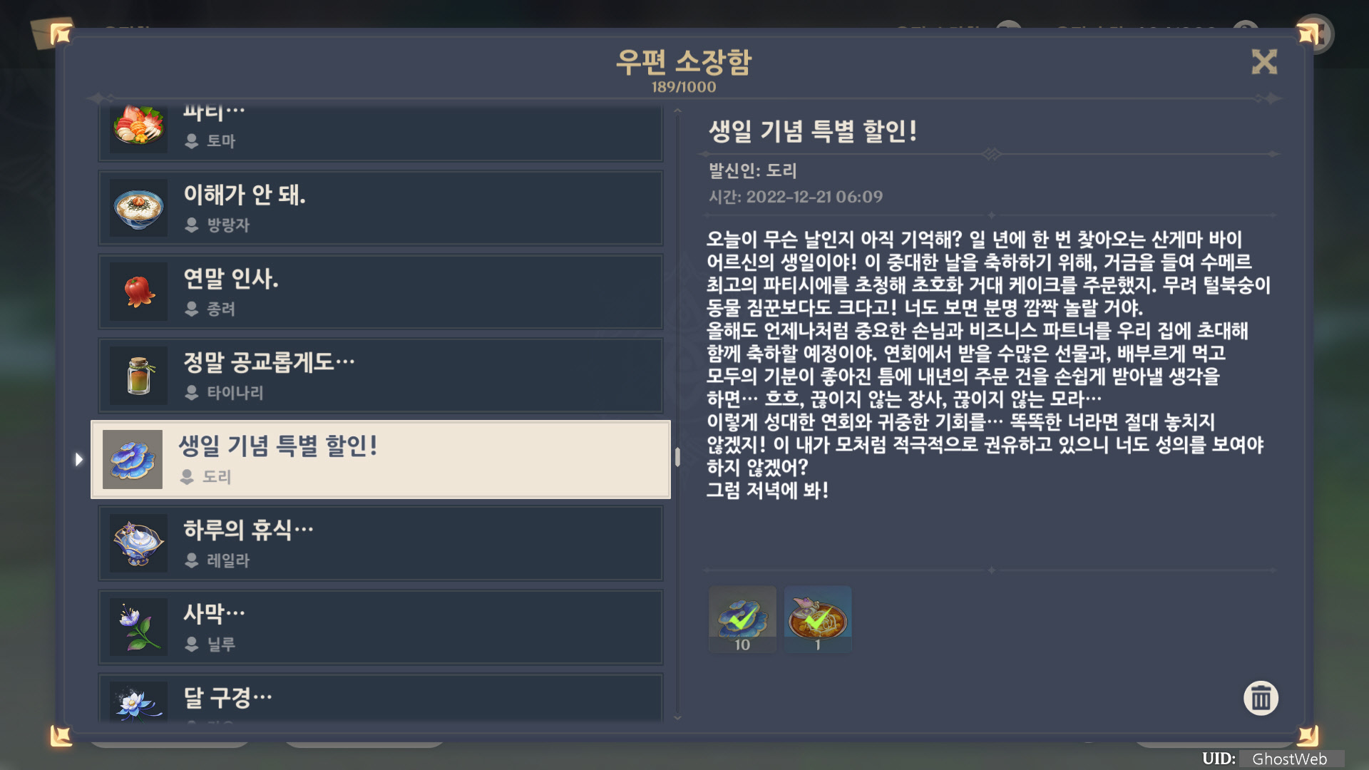 플레이어가 프로필에 설정한 생일 날짜에 맞춰 메일로 편지와 아이템을 보내주기도 하니 참고하세요.