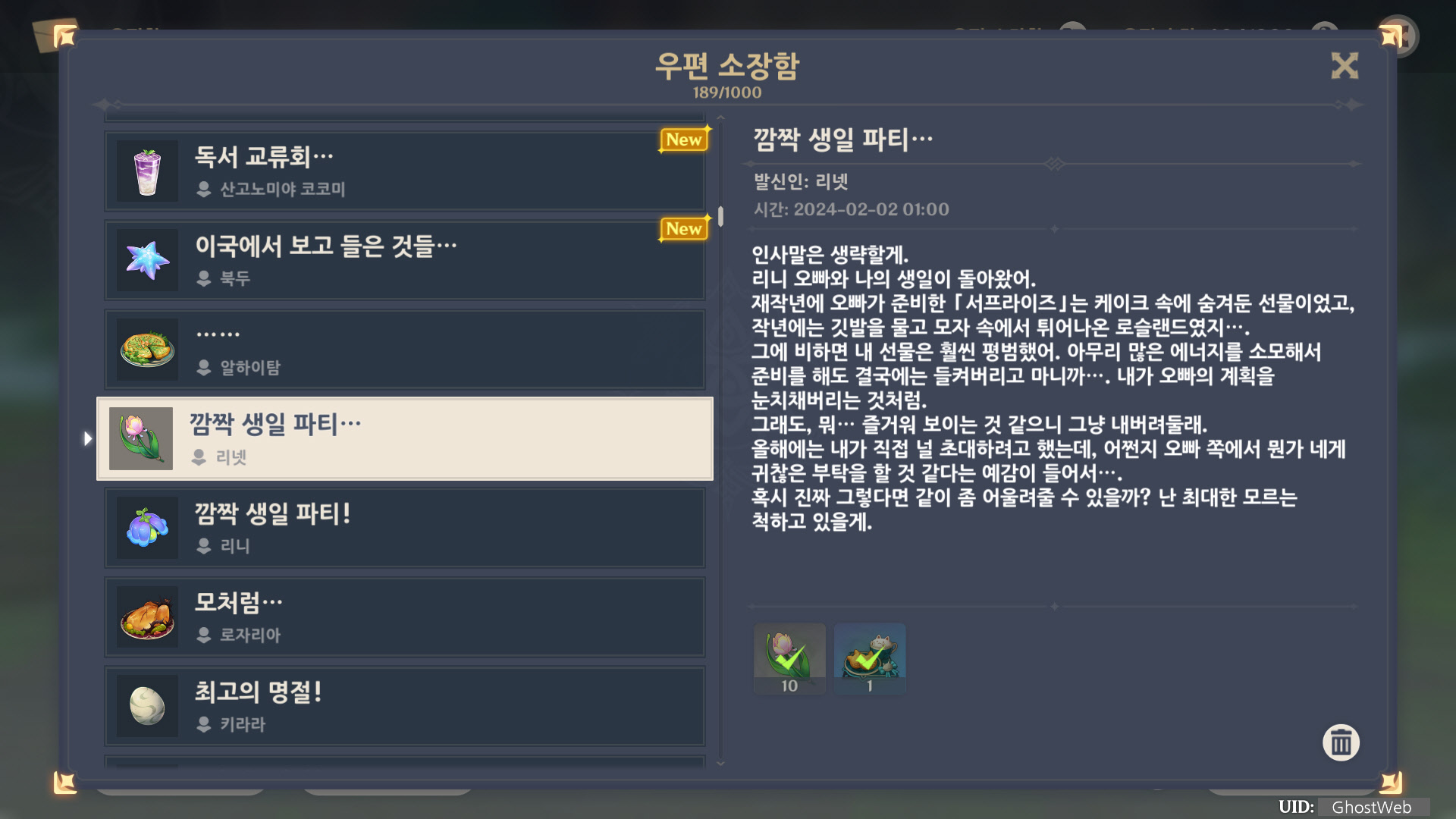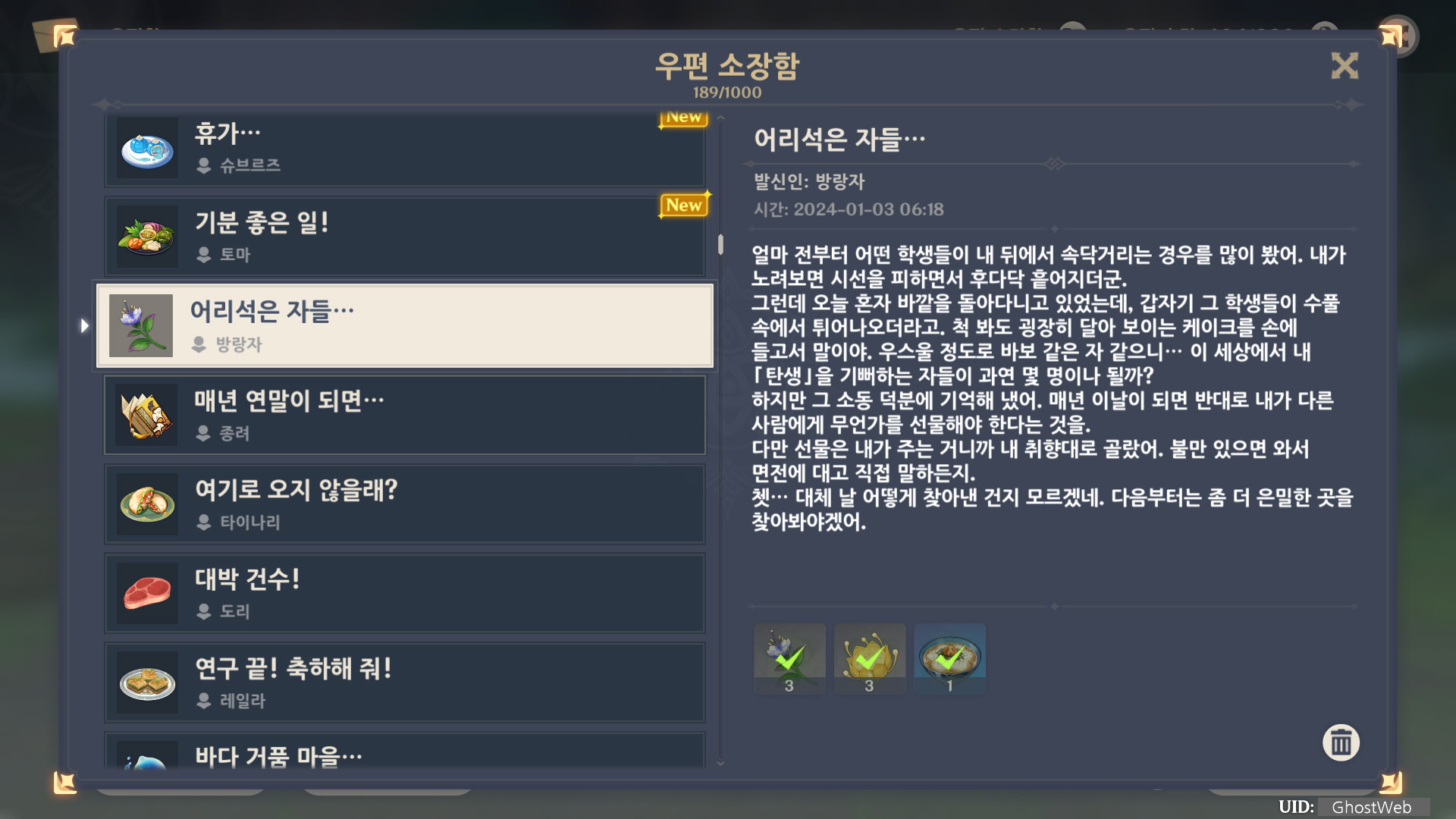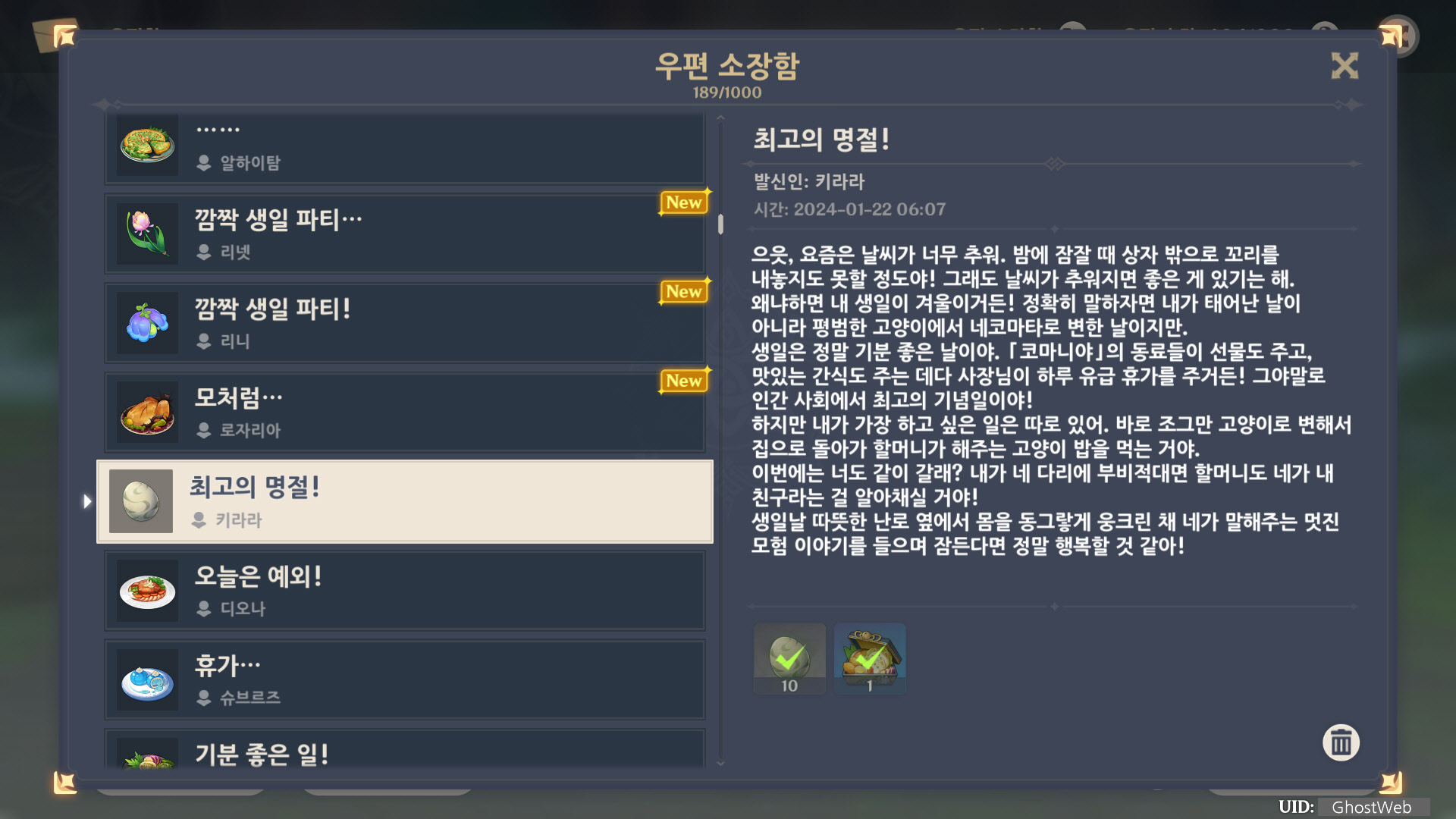 | [원신] 우편 소장함 모음 / 정리 (2023년) (0) | 2024.06.22 |