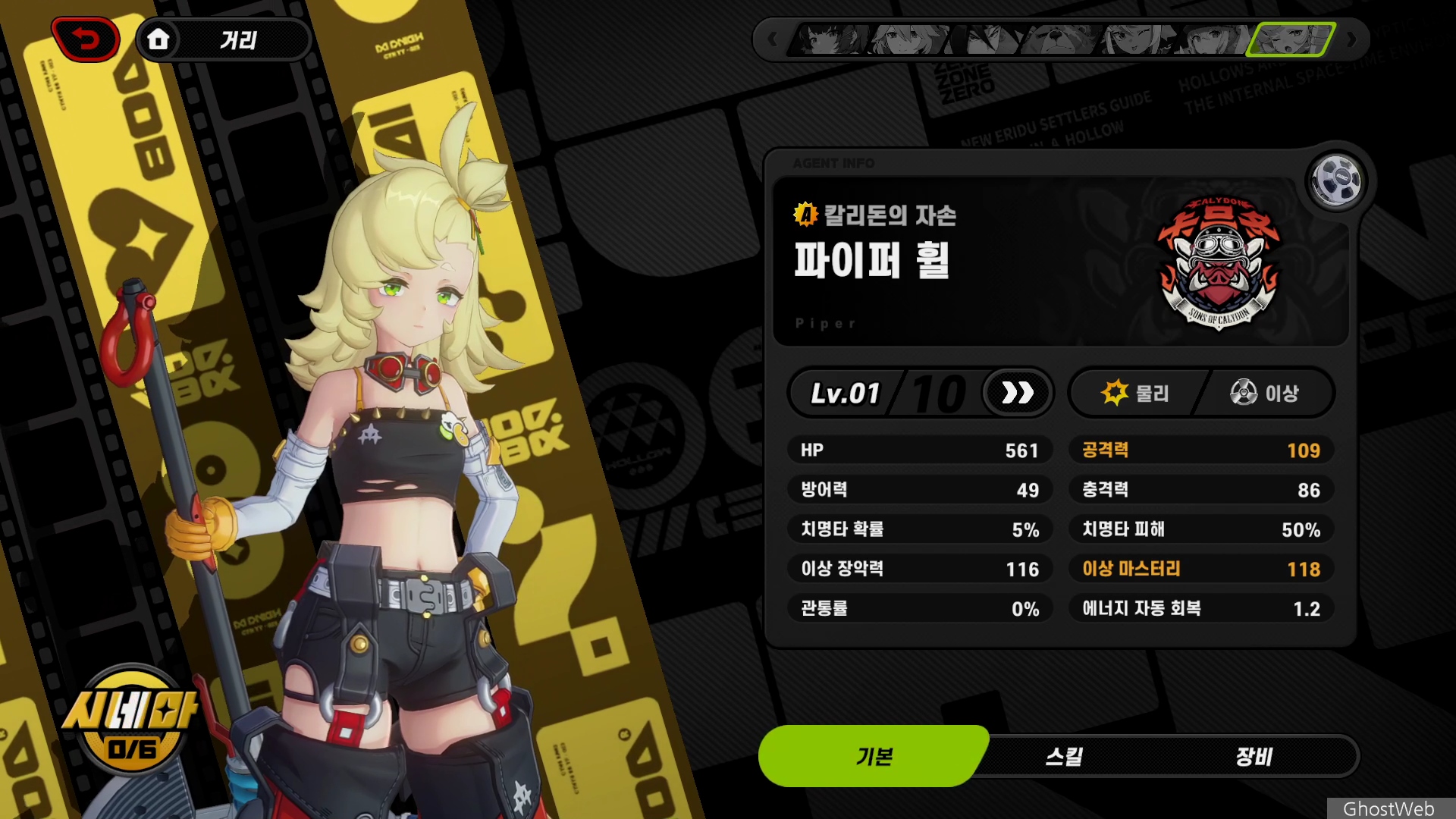 | 4 | 숙련된 기교 | 파티 내 임의의 캐릭터가 적에게 속성 이상 효과 부여 시 파이퍼가 에너지를 20pt 회복한다. 30초 동안 최대 1회 발동한다. |