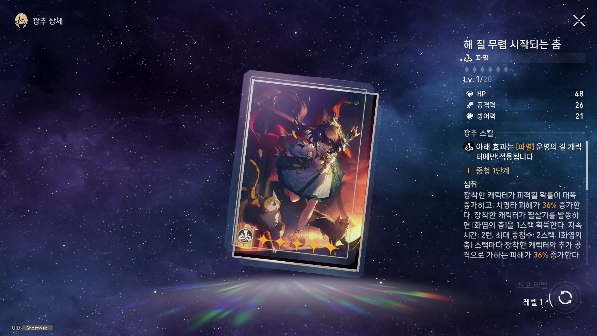 - 장착한 캐릭터가 필살기를 발동하면 화염의 춤을 1스택 획득한다.