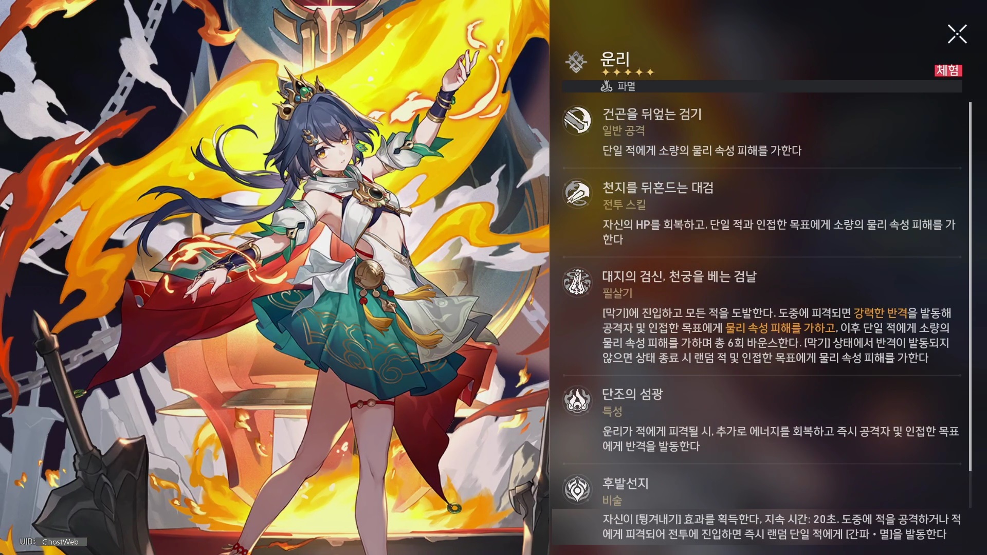 반격 발동 시 운리의 공격력이 30% 증가한다. 지속 시간 : 1턴 |