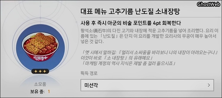 1. 대표 메뉴 고추기름 난도질 소내장탕 (3600)