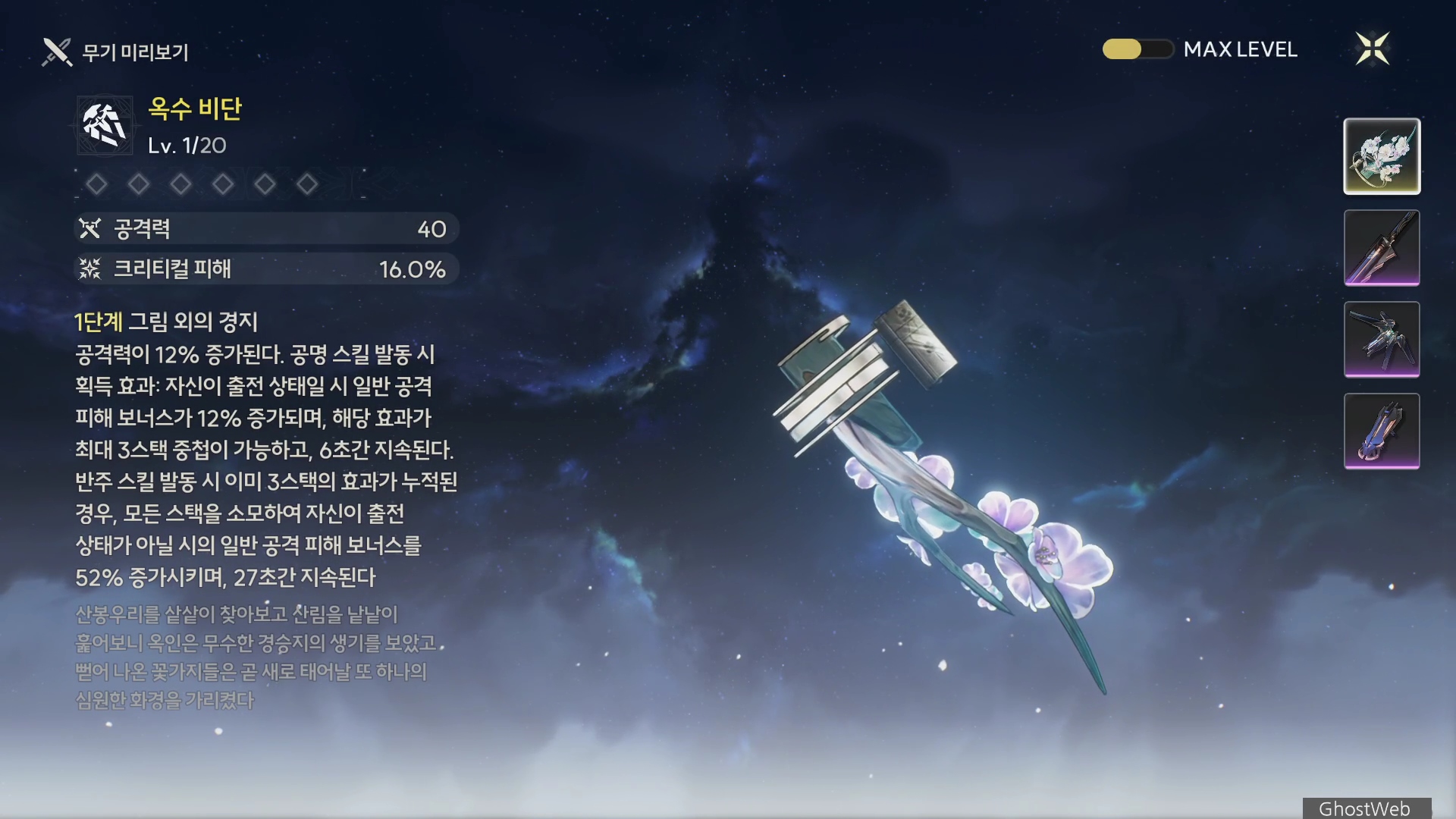 | 4 | 수류부채 | - 절지가 공명 해방 상상과 현실을 발동할 시 파티 내 캐릭터의 공격력이 20% 증가되며, 30초간 지속된다. |