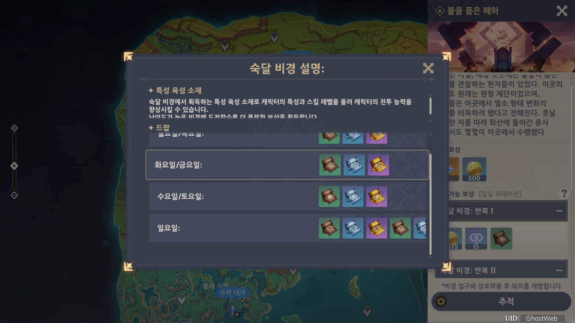 지도에서 나타 솟구친 언덕 아래 위치하고 있으며 요일마다 얻을 수 있는 캐릭터 특성 소재가 다르기 때문에 키울 캐릭터가 어떤 소재를 소모하나를 알아 두시기 바래요.