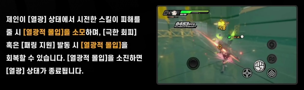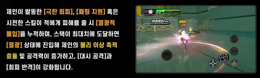 - 제인이 열광 상태에서 시전한 스킬이 피해를 줄 시 열광적 몰입을 소모하며, 극한 회피 혹은 패링 지원을 발동할 시 열광적 몰입을 회복할 수 있다.