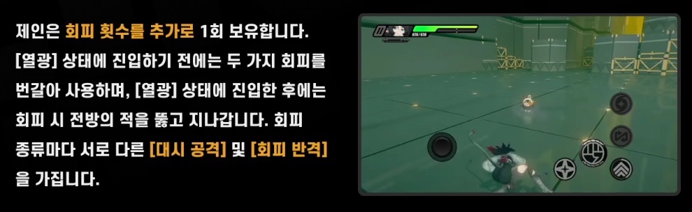 - 제인은 회피 횟수를 추가로 1회 보유하며, 열광 상태 진입 전에는 두 가지 회피를 번갈아 사용하고, 열과 상태 진입 후에는 회피 시 전방의 적을 뚫고 지나갈 수 있다.