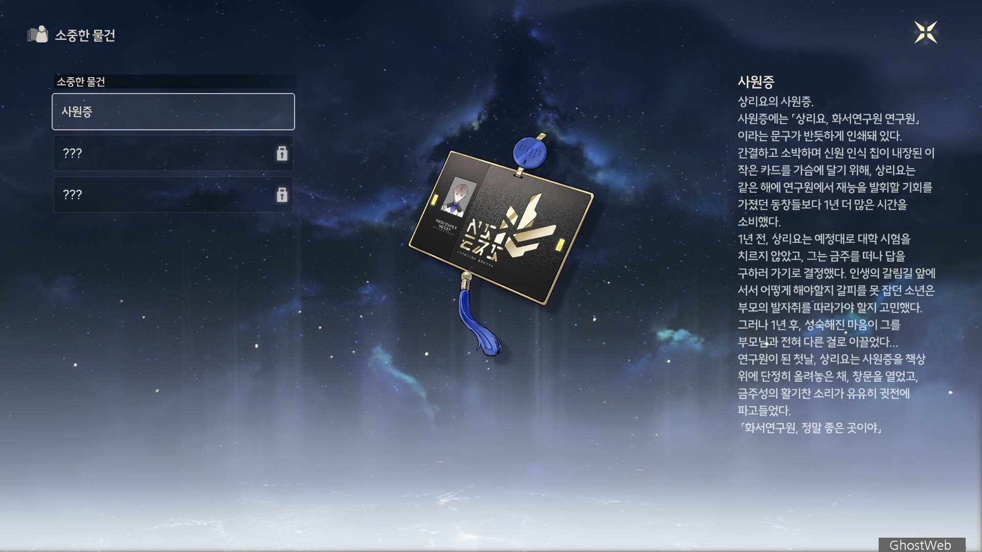 | 자기 소개 | 저는 상리요라고 합니다. 화서연구원의 연구원이죠. 방랑자, 당신의 공명 주파수는 참 특이하고 귀중해요. 진리를 찾는 길목에서 당신은 유일무이한 비콘일까요, 아니면 종착역에서 누군가를 기다리고 있는 깃발일까요? 궁금하네요. |