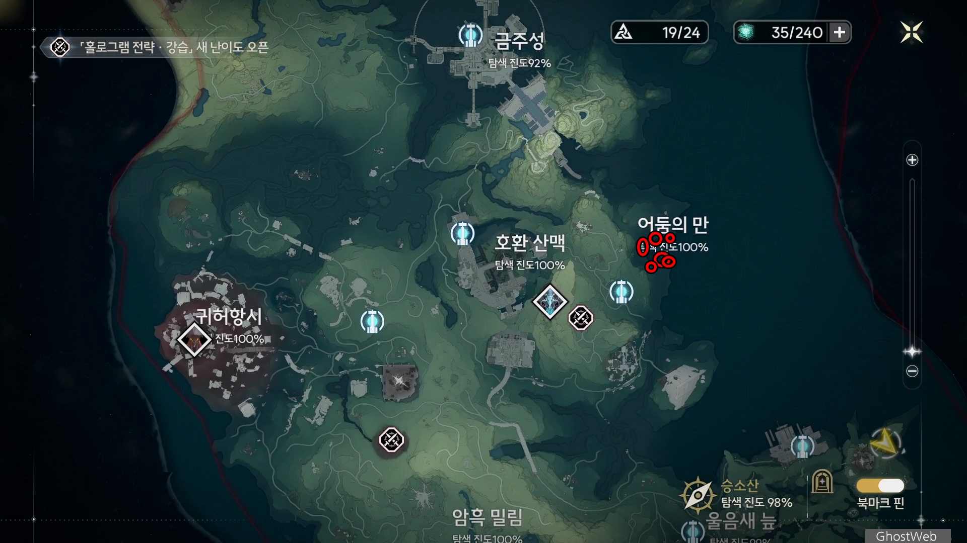 금주성 기준 오른쪽 위, 아래 바다 근처 어둠의 만에 많은 수량이 위치하고 있어요.