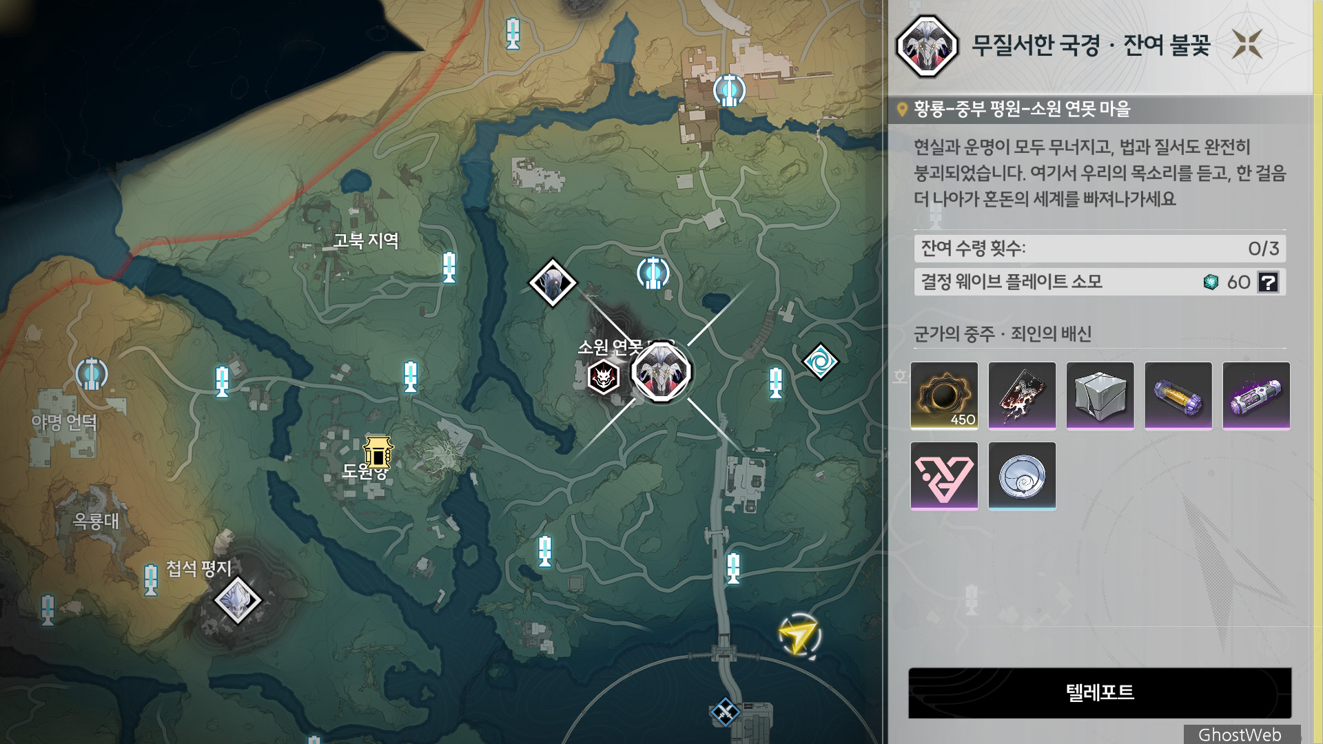 무질서한 국경 - 잔여 불꽃은 게임 초반에 방문하는 소원 연못 마을에 위치하고 있으며 지도에서 바로 텔레포트가 가능해요.
