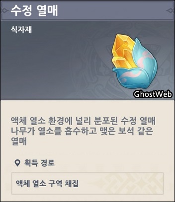 이번에는 나타에서 얻을 수 있는 식자재인 [ 수정 열매 ]를 파밍 가능한 위치를 정리해보도록 할게요.