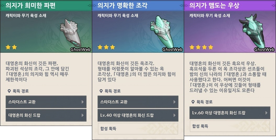 이번에는 캐릭터와 무기 육성 소재인 의지가 희미한 파편, 의지가 명확한 조각, 의지가 맴도는 우상을 얻을 수 있는 대영혼의 화신의 위치를 정리 해보도록 할게요.