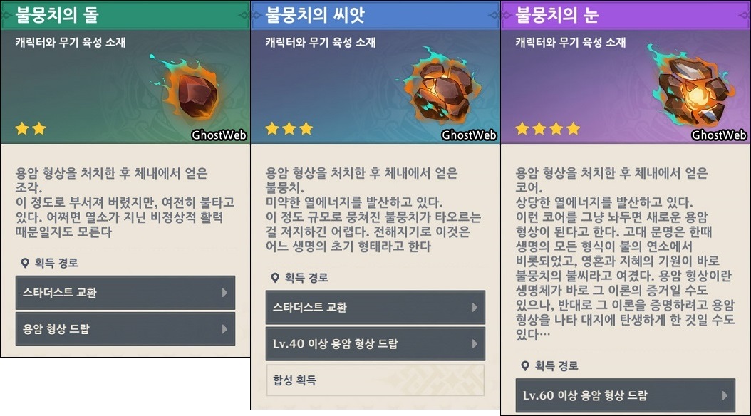 이번에는 캐릭터와 무기 육성 소재인 불뭉치의 돌, 불뭉치의 씨앗, 불뭉치의 눈 얻을 수 있는 용암 형상의 위치를 정리 해보도록 할게요.