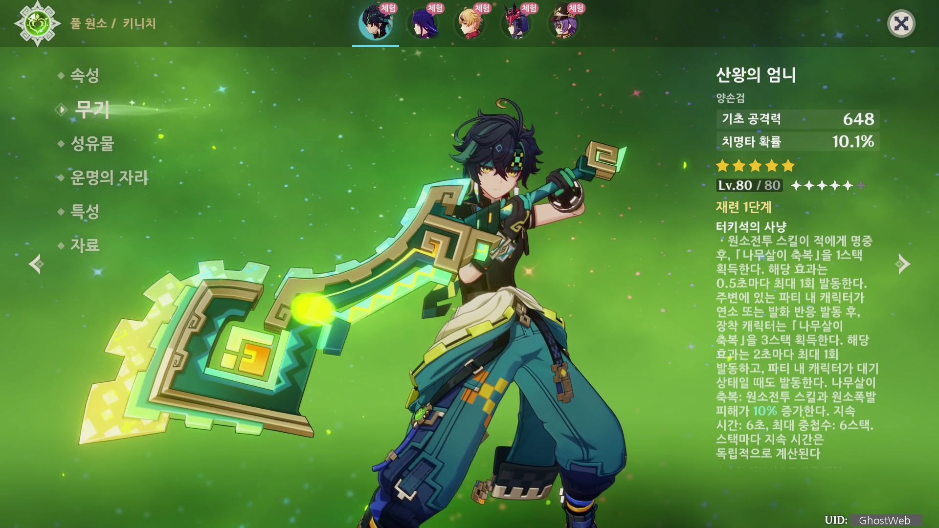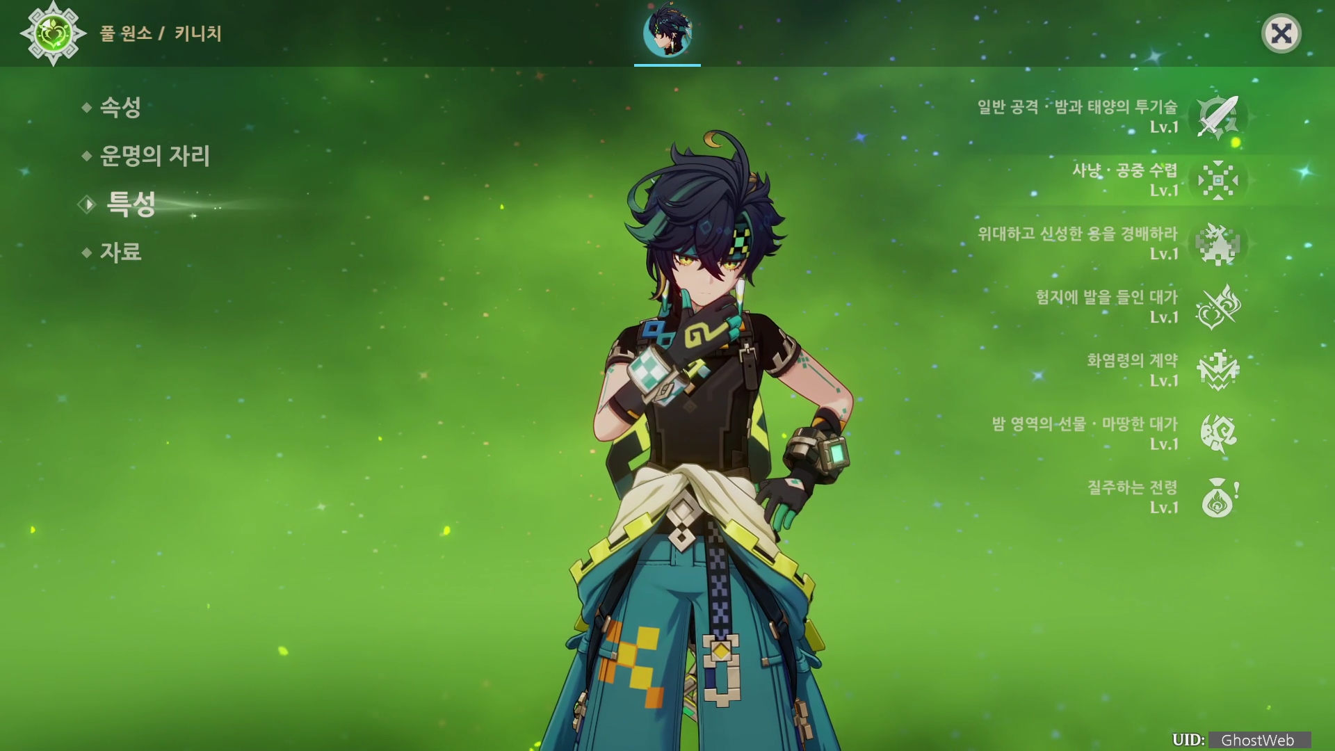 - 키니치의 원소전투 스킬이 적에게 명중 시, 적의 풀 원소 내성이 30% 감소한다.