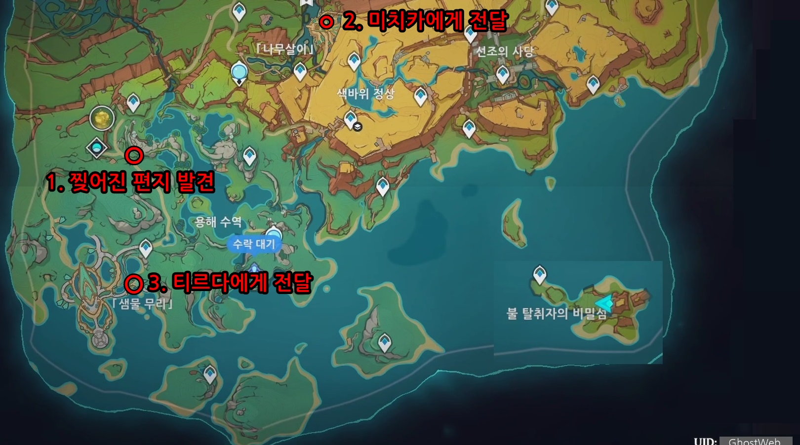 찢어진 편지는 무지개령의 정토 비경 오른쪽에 있는 곳에서 발견할 수 있는데, 이를 들고 나무 살이에 있는 미치카에게 전달 해주면 티르다 씨에게 편지를 전달해 달라는 부탁을 해요.