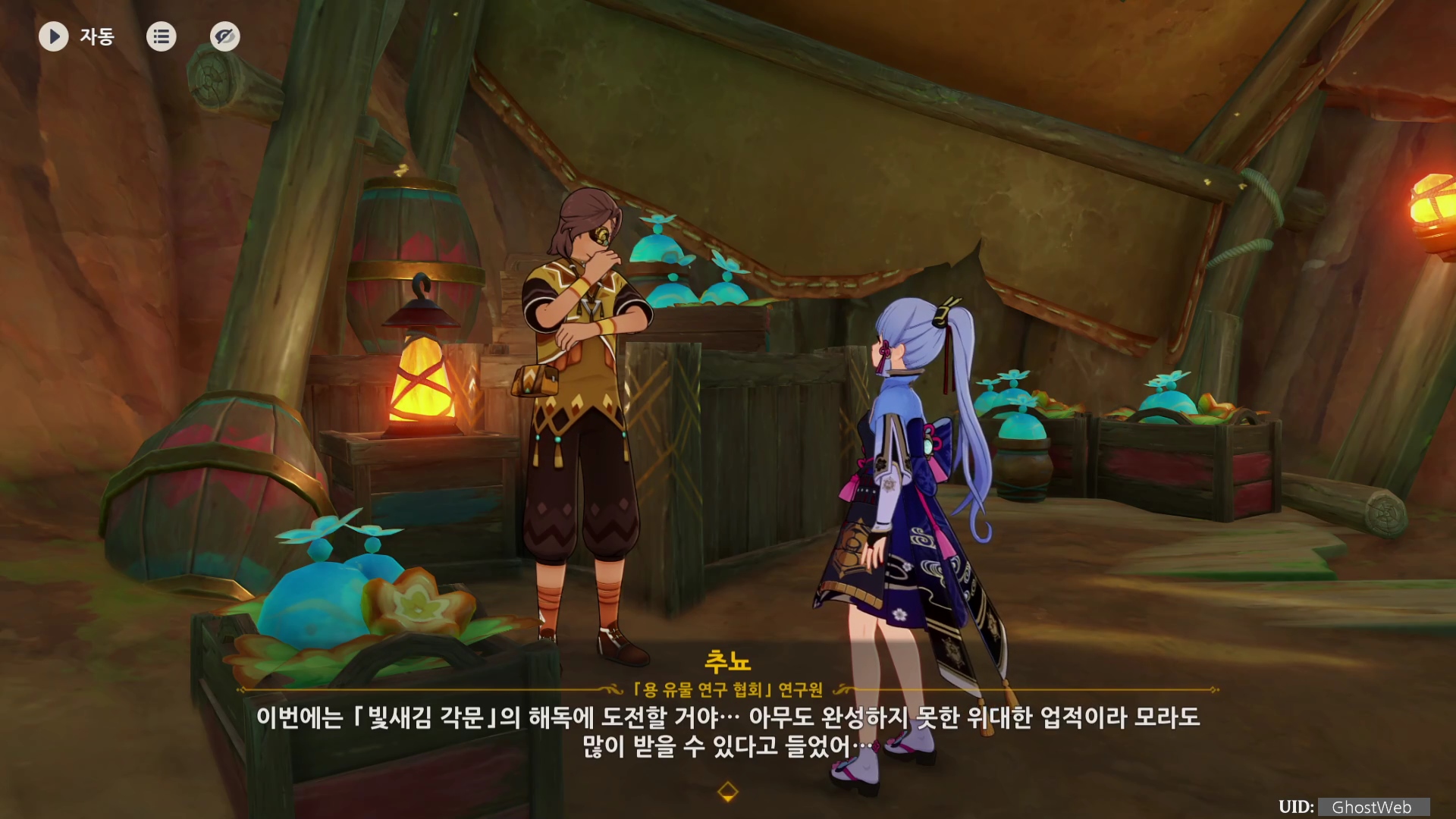 천막 안에 용 유물 연구 협회 연구원인 추뇨가 있는데, 말을 걸면 빛새김 각문을 해독할 거라면서 여행자에게 빛새김 각문 파편 4개를 찾아 가져다 달라는 부탁을 해요.