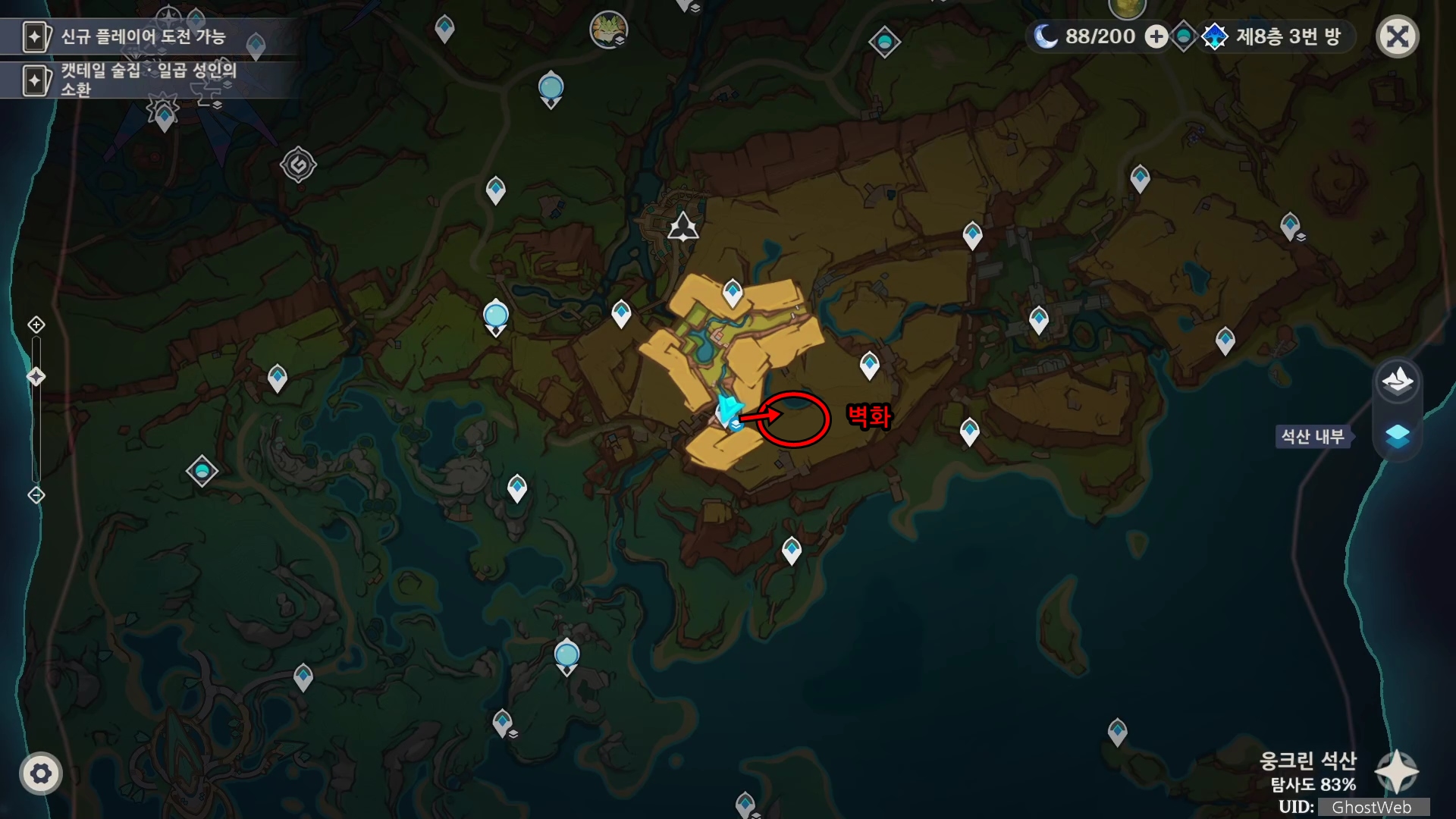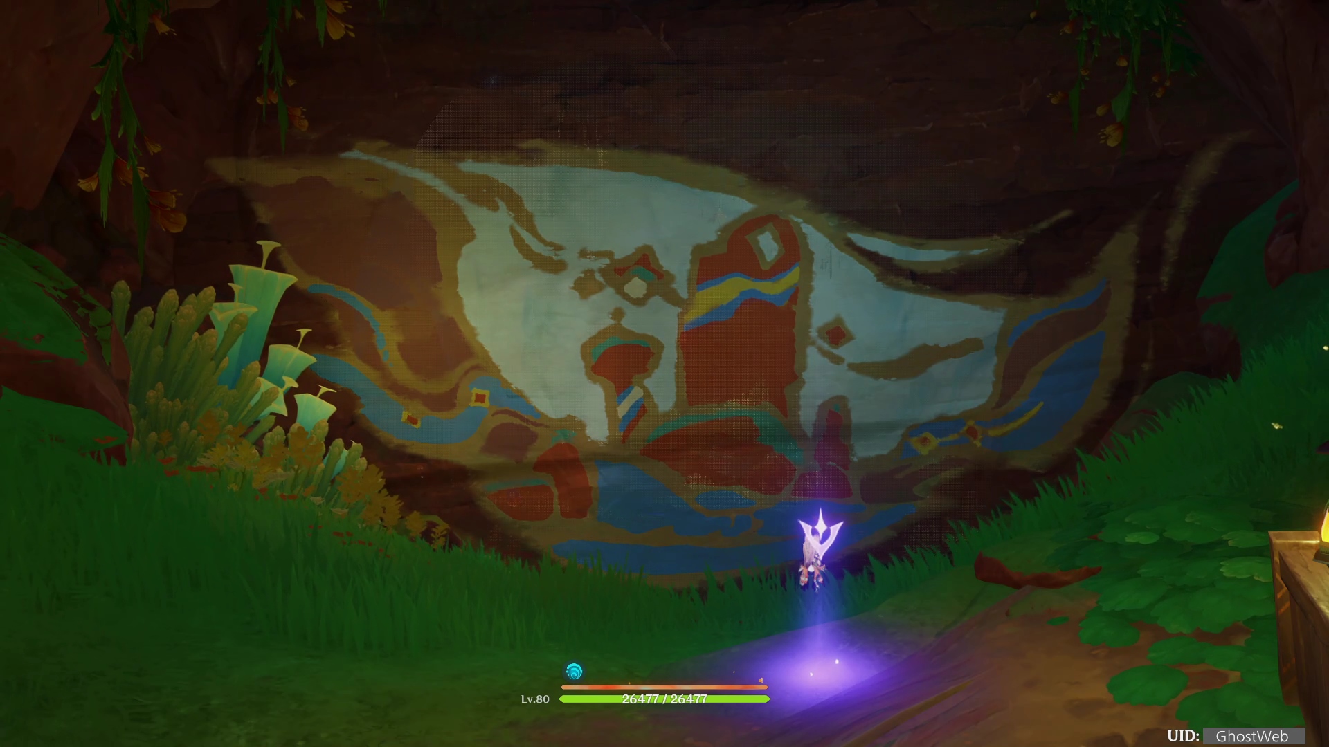 그라피티가 그려진 돌 파편 6개를 모아 아래의 지역으로 이동하여 벽화를 완성하면 벽화 뒤에 숨겨진 지역이 생기면서 [ 그림 속에 펼쳐진 세상 ] 전망 포인트, [ 그림 속으로... ] 업적을 달성할 수 있으며, 숨겨진 지역에서는 신의 눈동자와 보물상자를 얻을 수 있어요.