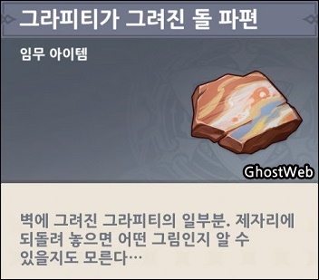 해당 지역에서 카메라와에 관찰 상호 작용하면 나오는 슬라임을 처치하면 나오는 보물상자에서 그라피티가 그려진 돌 파편를 얻을 수 있어요.