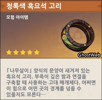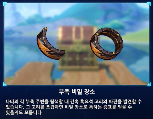 현재 각 3개 부족 마을 근처에 비밀 장소가 있는데, 나타 지역 탐험을 하다 보면 만날 수 있는 보물상자에서 흑요석 조각을 획득하고 같은 종류의 흑요석 조각 3개를 합성하면 흑요성 고리를 만들 수 있어요.