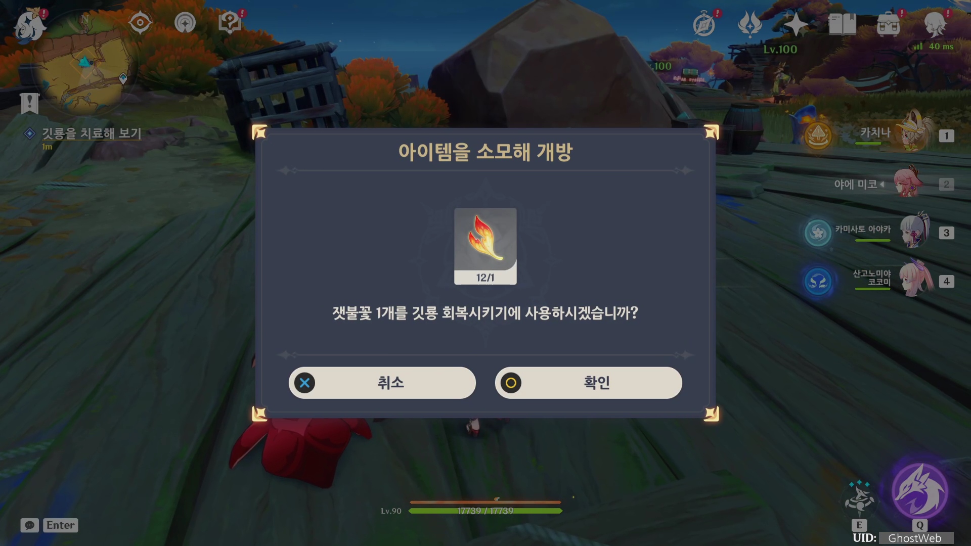 부족 용 무사들을 처치하고 주변에 있는 잿불꽃을 모아서 깃룡을 치료하면 깃룡이 하늘로 날아가며 임무 보상으로 원석 30개, 모라 37000을 획득할 수 있어요.