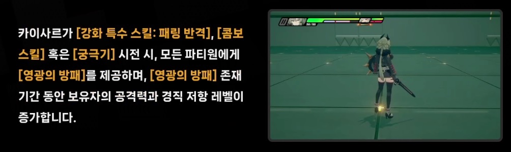 - [영광의 방패]는 출전 캐릭터가 보유하며, 실드량은 모든 파티원이 공유하고, 받는 단일 피해가 실드량을 초과하지 않는다.