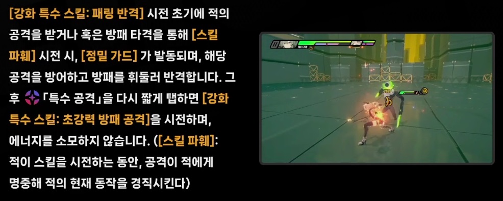 - [강화 특수 스킬: 패링 반격] 시전 후 에너지가 충분한 상태에서 충전된 특수 스킬을 짧게 탭하여 시전