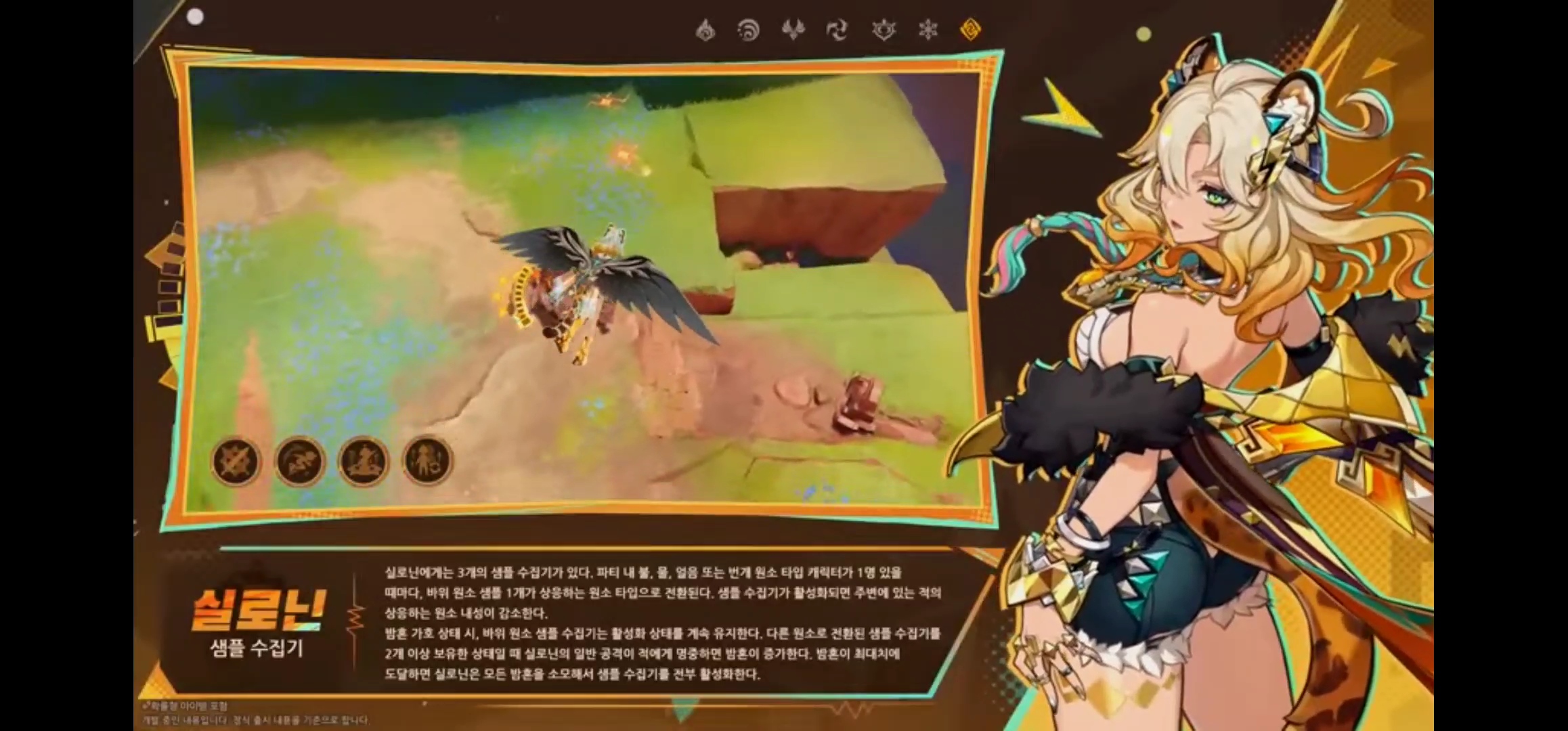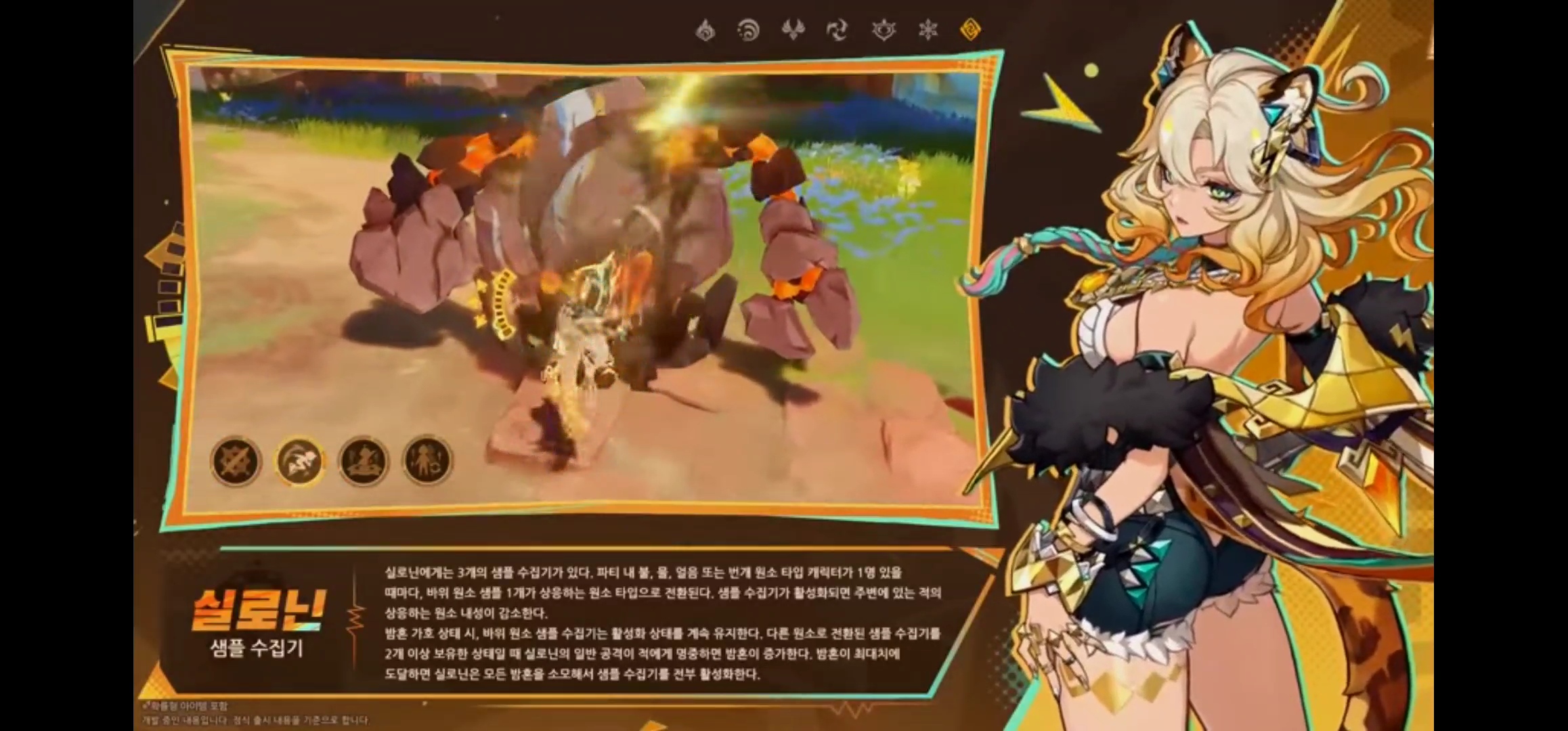 - 샘플 수집기를 통해 파티 내의 불, 물, 얼음, 번개 원소 타입 1명이 있을 때마다 바위 원소 샘플 1개에 상응하는 원소 타입으로 전환하고 샘플 수집기 활성화가 되면 주변에 있는 적의 상응하는 원소 내성을 감소합니다.