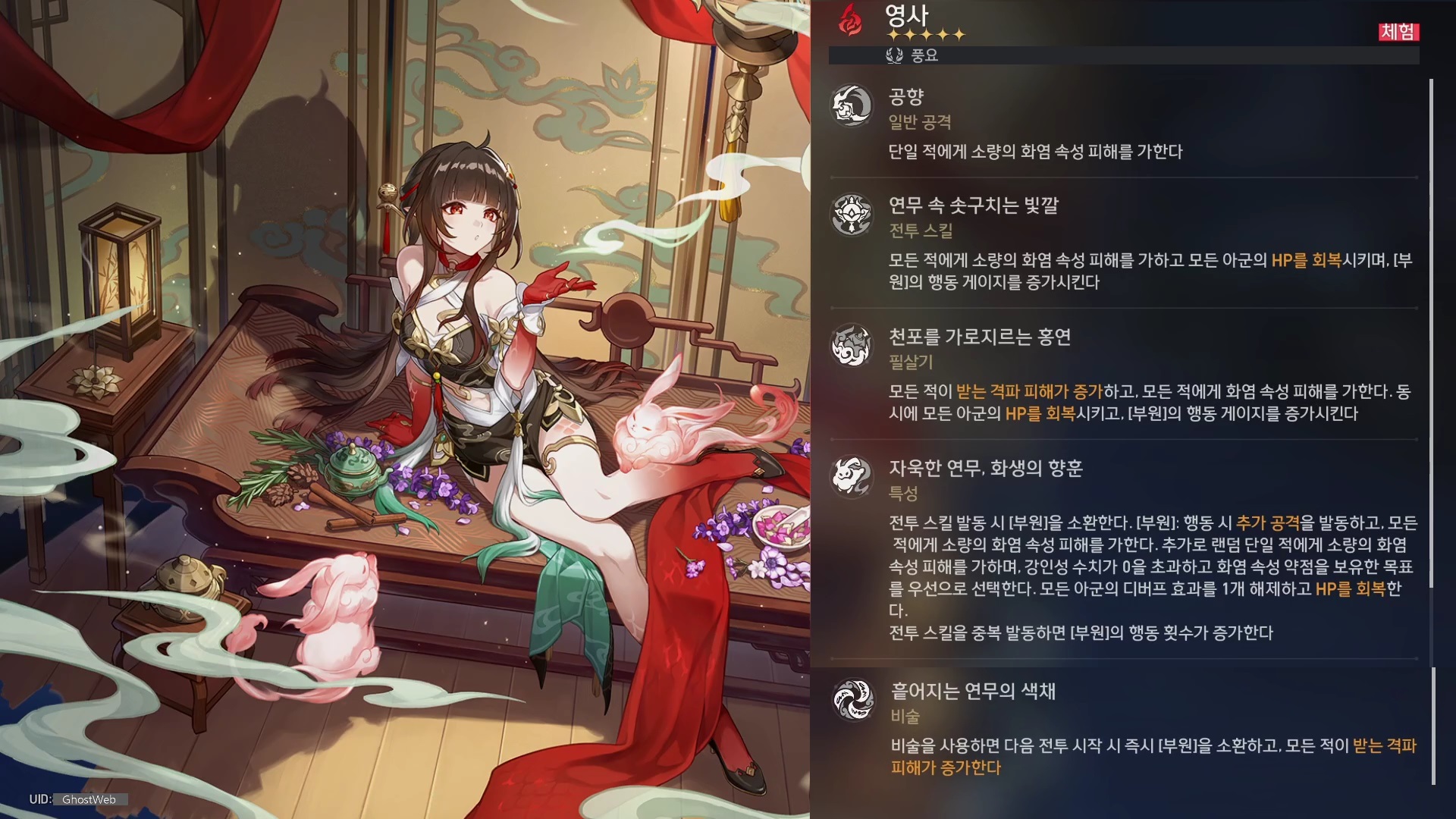 | 6 | 새벽녘 짙게 밴 난초향 | 부원이 필드에 있을 시 모든 적의 모든 속성 저항이 20% 감소한다. 부원이 공격 시 추가로 피해를 4회 가하고, 피해를 가할 때마다 랜덤 단일 적에게 영사 공격력의 50%만큼 화염 속성 피해와 5pt의 강인성 감소 수치를 가한다. 강인성 수치가 0을 초과하고 화염 속성 약점을 보유한 목표를 우선으로 선택한다. |