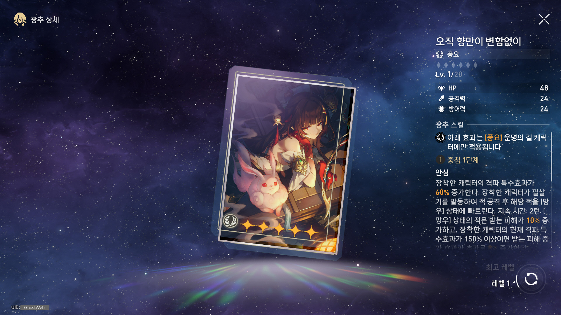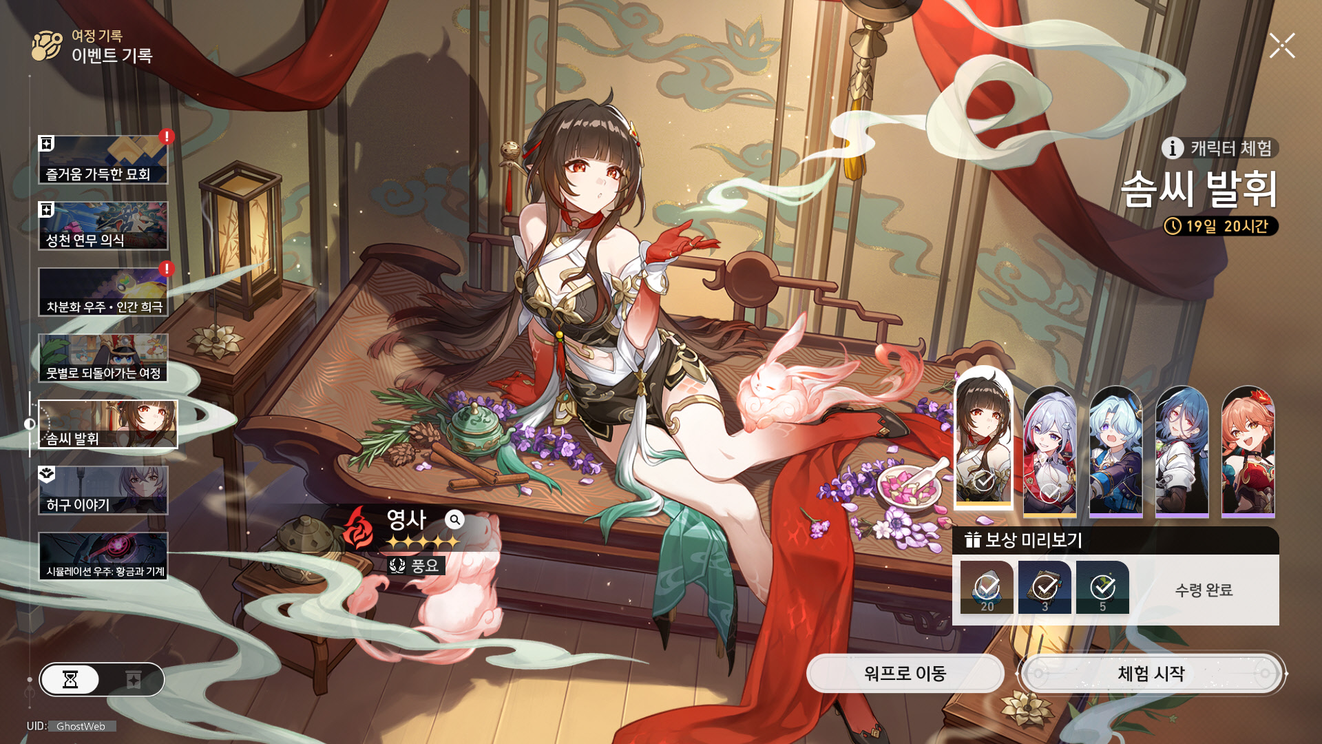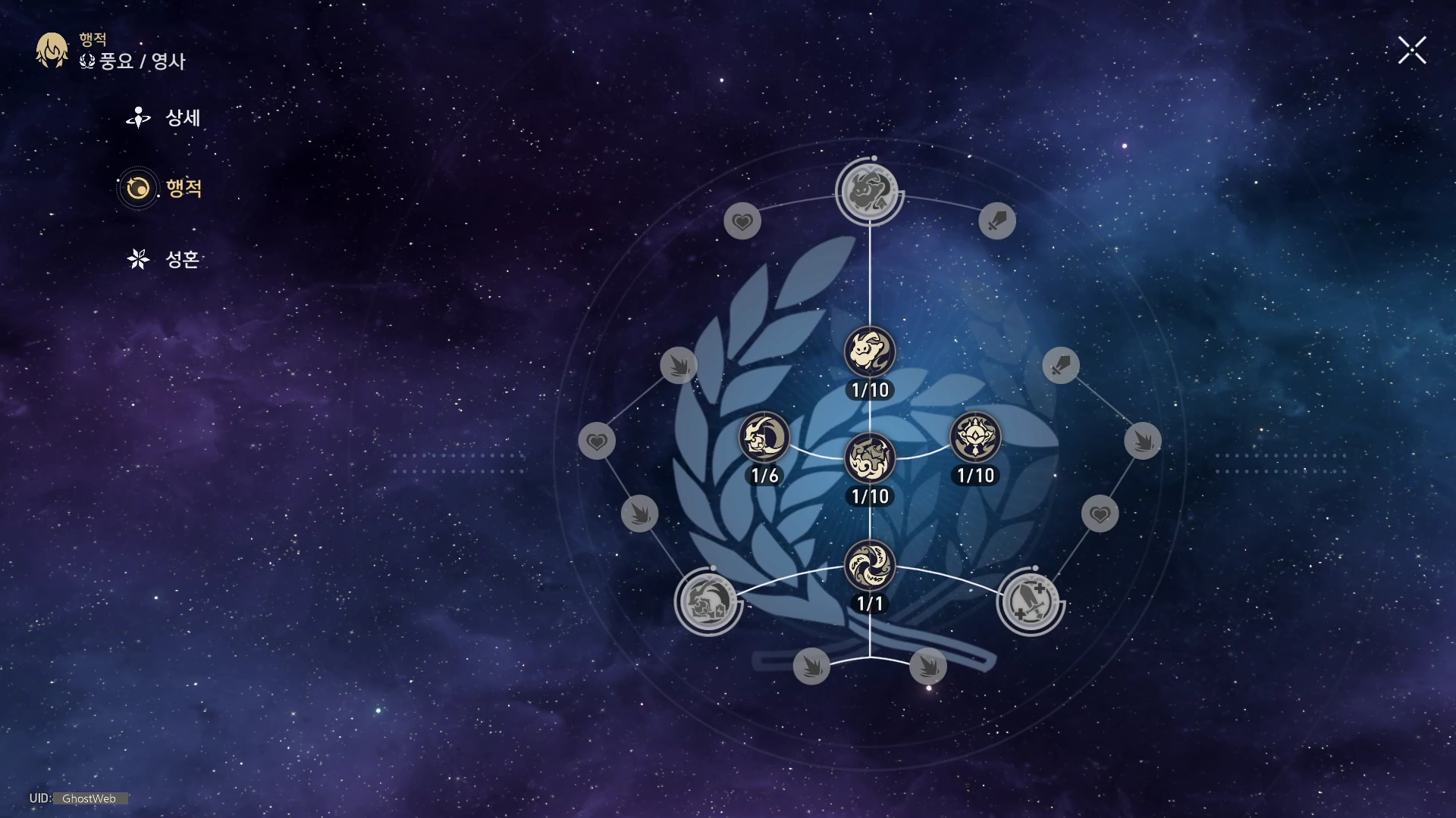 | 5 | 둥글게 피어나는 향, 기울지 않는 중심 | 전투 스킬 레벨 + 2 (최대 레벨 15) 일반 공격 레벨 + 1 (최대 레벨 10) |
