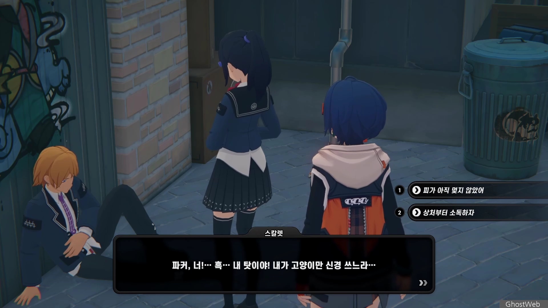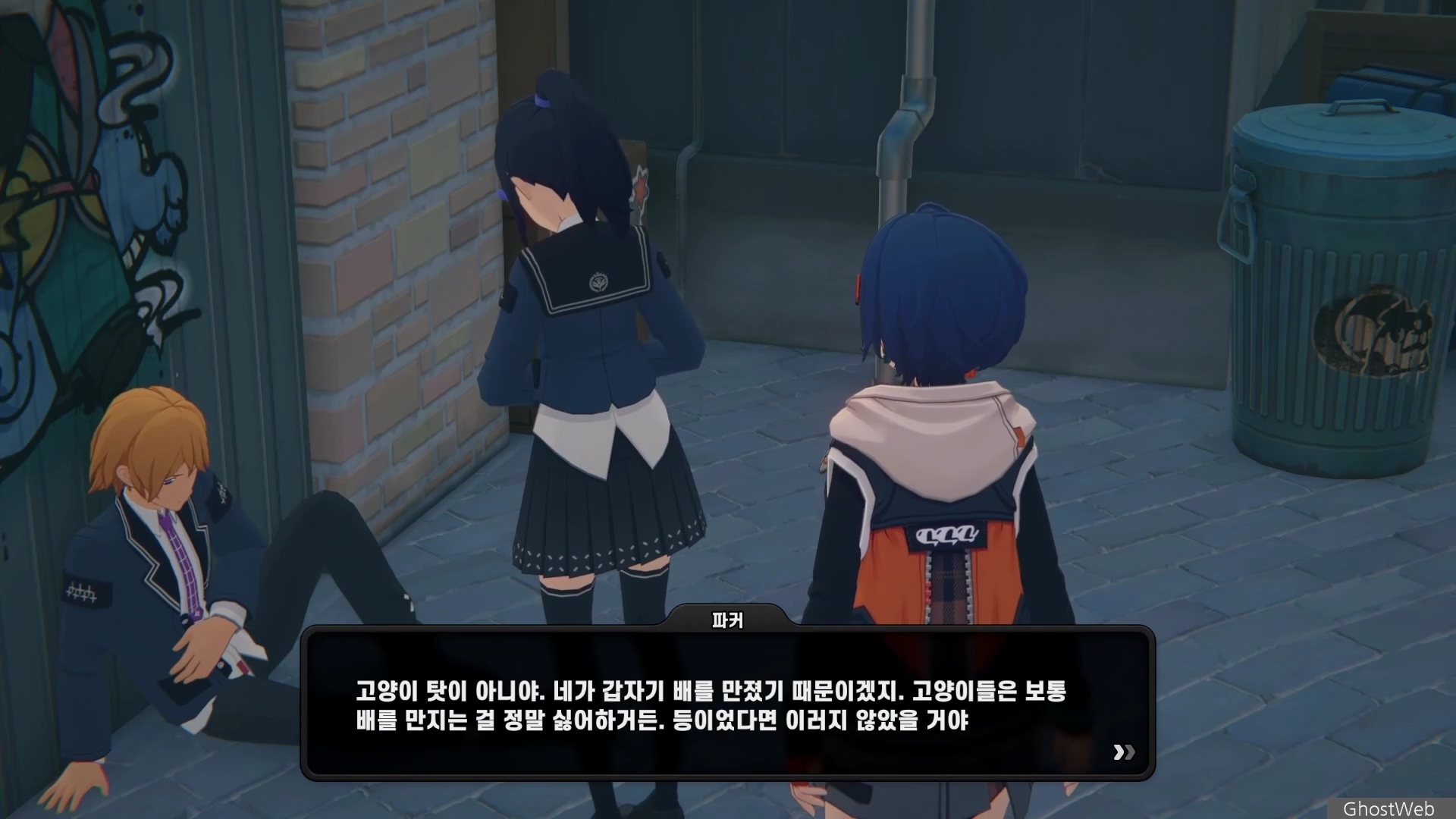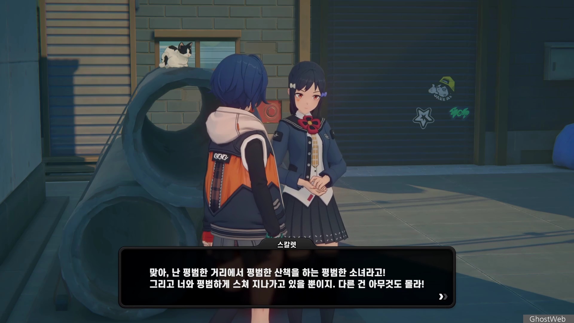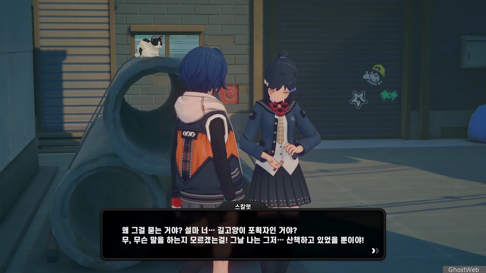 6단지 공터에 스칼렛이라는 학생이 서 있는데 길고양이에 대해 물어보면 도망가는데 오해를 풀기 위해 쫓아갔지만 파커라는 학생과 대화를 해요.